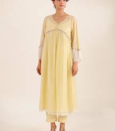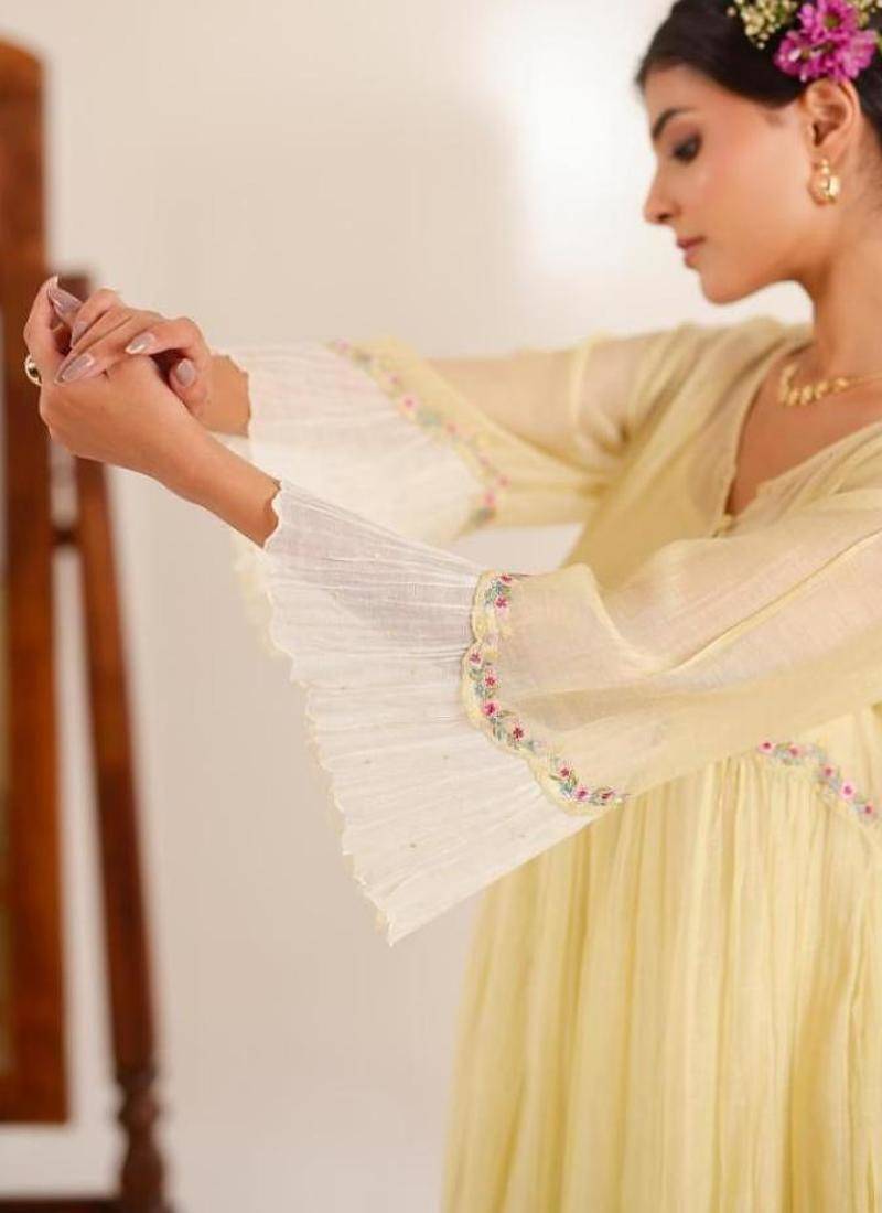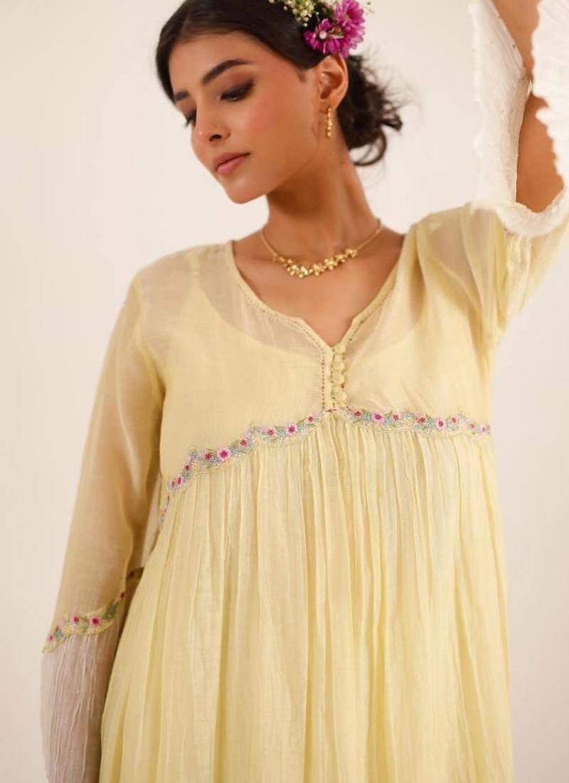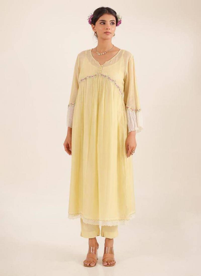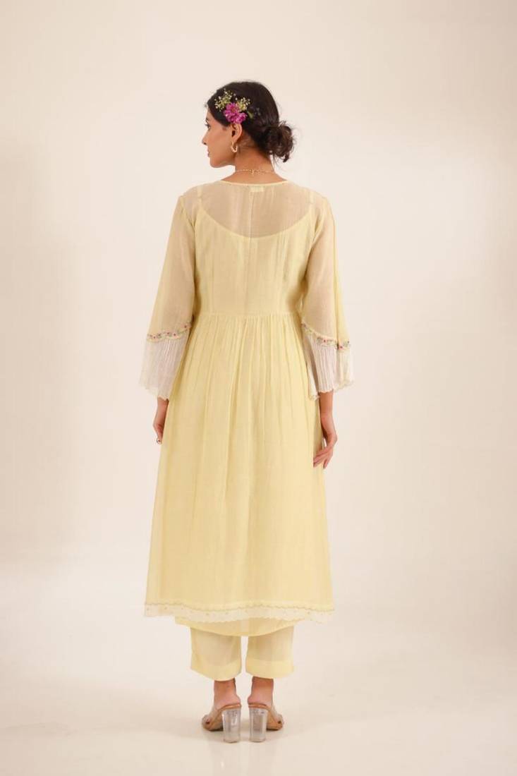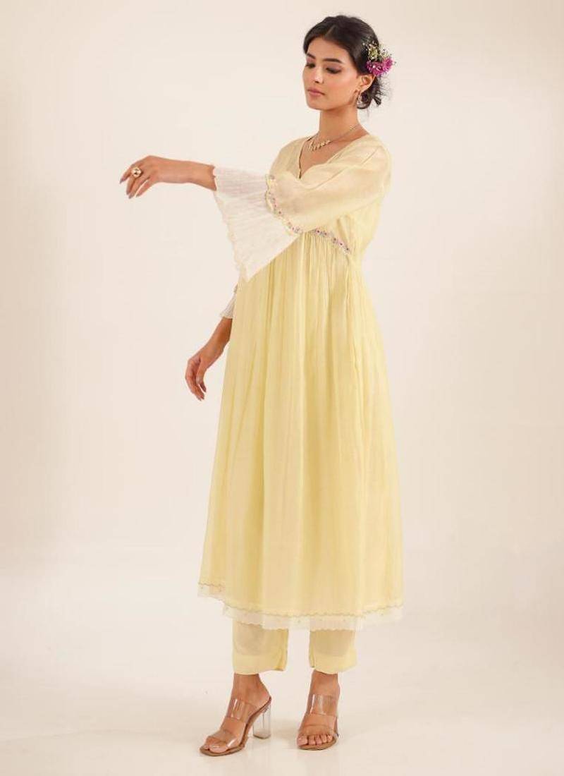 | Product Description | A Soft Lemon Yellow Nyraa Kurta Set With Delicate Floral Multicolor Resham Embroidery And A Very Beautiful Pleated Sheer Sleeves.Light, Flowy Fabric Paired With A Comfortable Slip And Perfect For Festive Wear.It Also Has Matching Straight Pants For A Complete Look. |