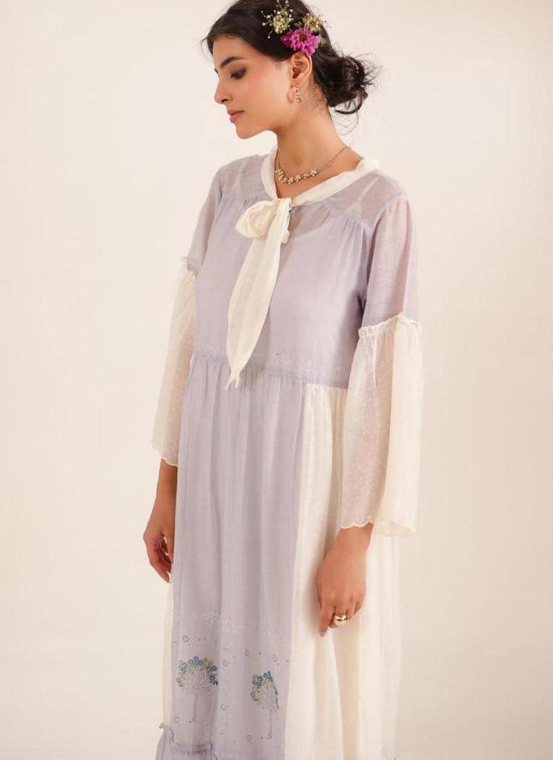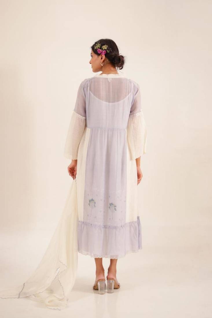 | Product Description | A Powder Blue And Cream Panelled Dress With Block Print On It And A Charming Bow Tie Neckline.Sheer Flared Sleeves With Scalloped Details Which Add An Elegant Touch.Comes With A Matching Soft Slip And A Dupatta With Intricate Embroidery, Completing The Graceful And Feminine Look. Light, Flowy, And Perfect For Summer Days Or Special Occasions. |