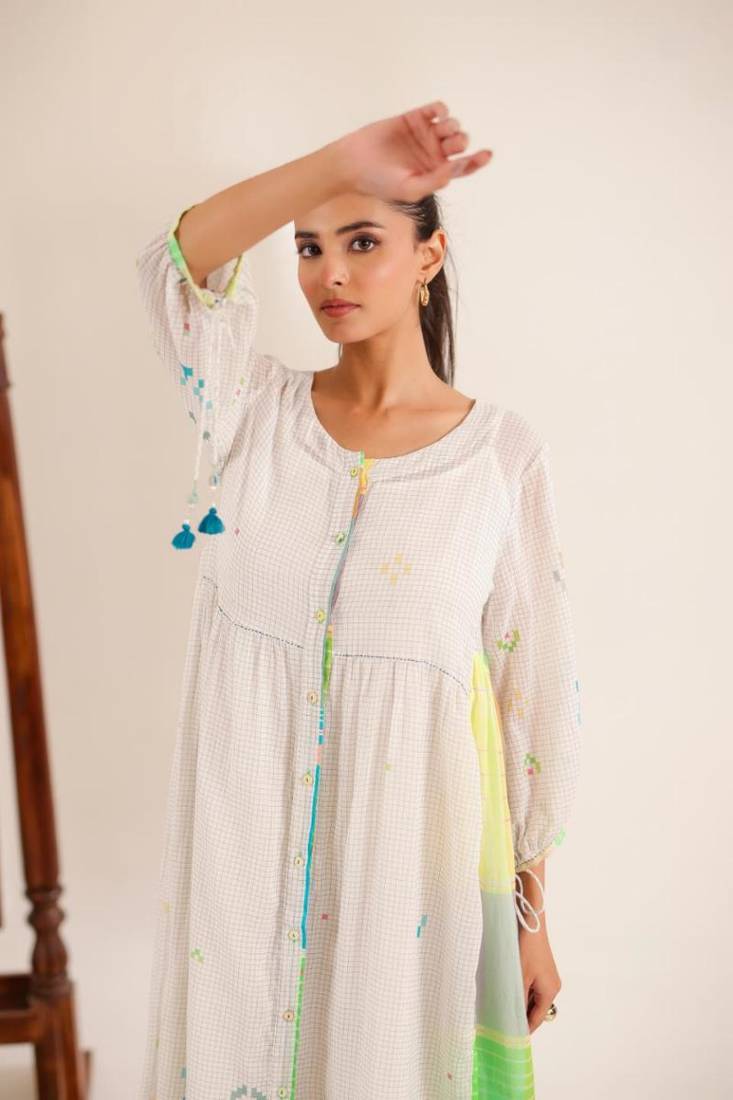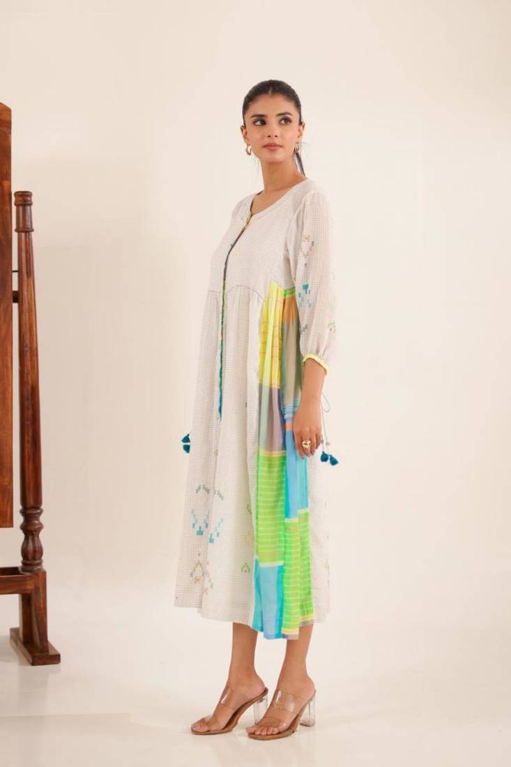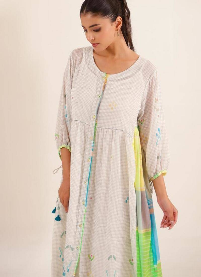 | Product Description | This Outfit Is A Light And Flowy Long Dress Made From Soft Checkered Fabric.It Has Full Sleeves With A Little Puff And Tie Up Tassels At The Sides. The Dress Features Soft Colors With Small Patterns And Pixel Style Designs All Over.A Mix Of Bright Panels In Blue, Yellow, And Green On The Sides Adds A Fun Pop Of Color.The Front Is Buttoned Down, Making It Easy To Wear.It Also Comes With A Comfortable And Soft Slip. |