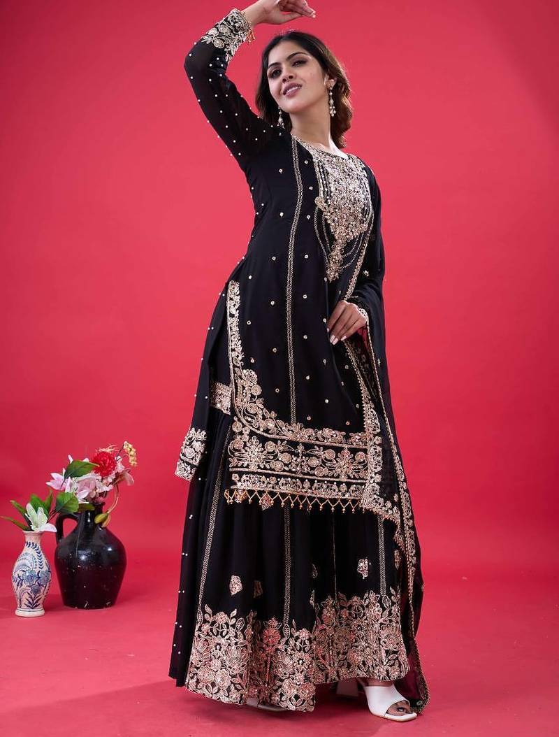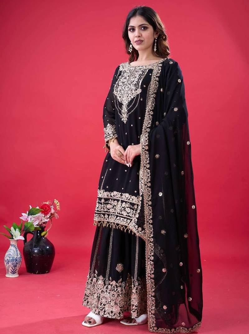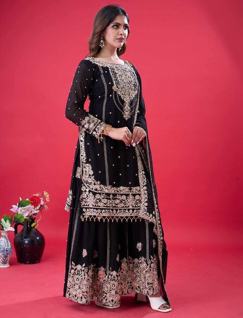 Black color faux georgette embroidery work sharara set stitched