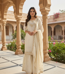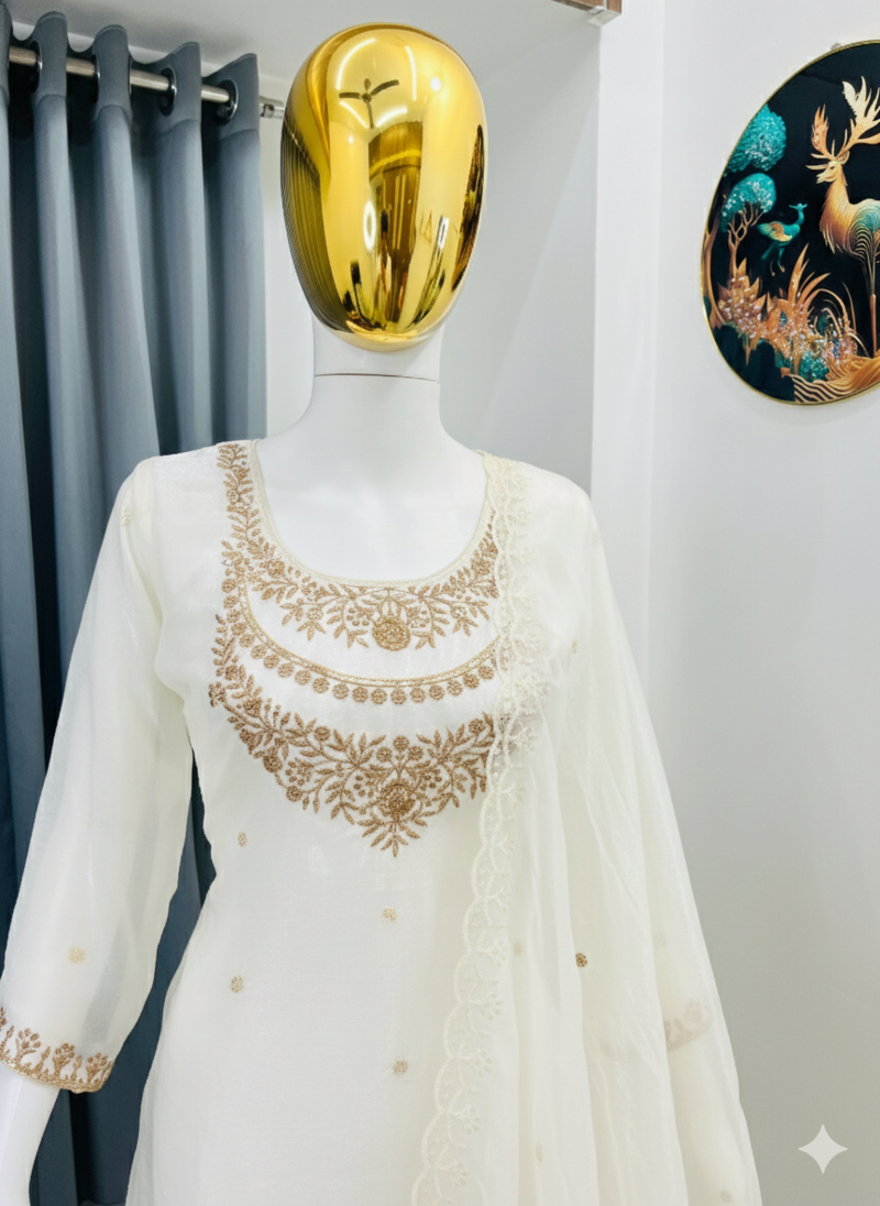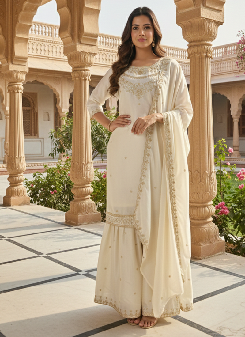Cream color fendy satin silk heavy embroidery work sharara suit stitched