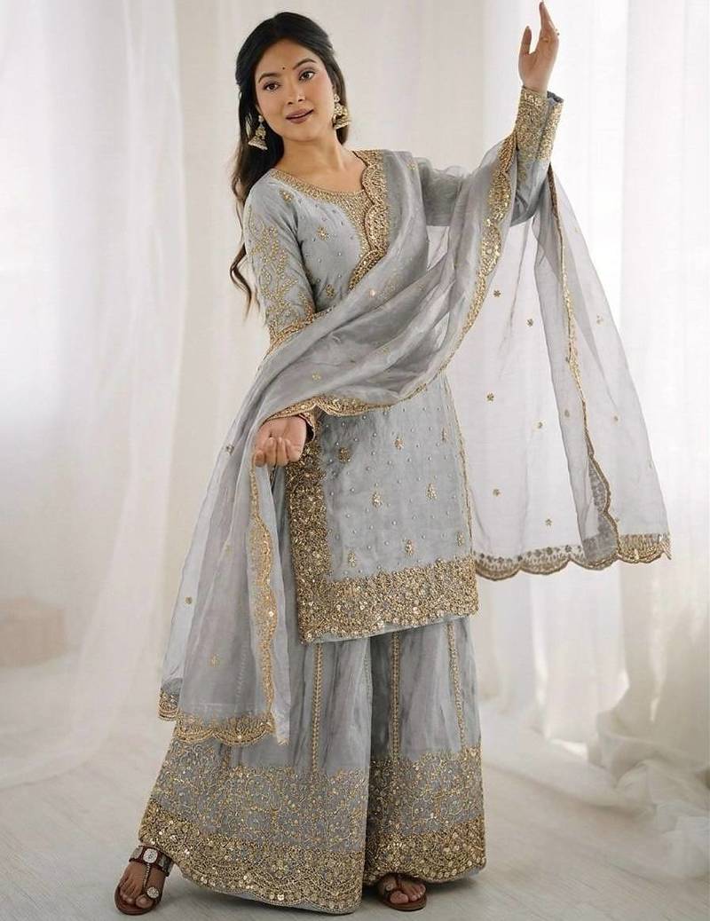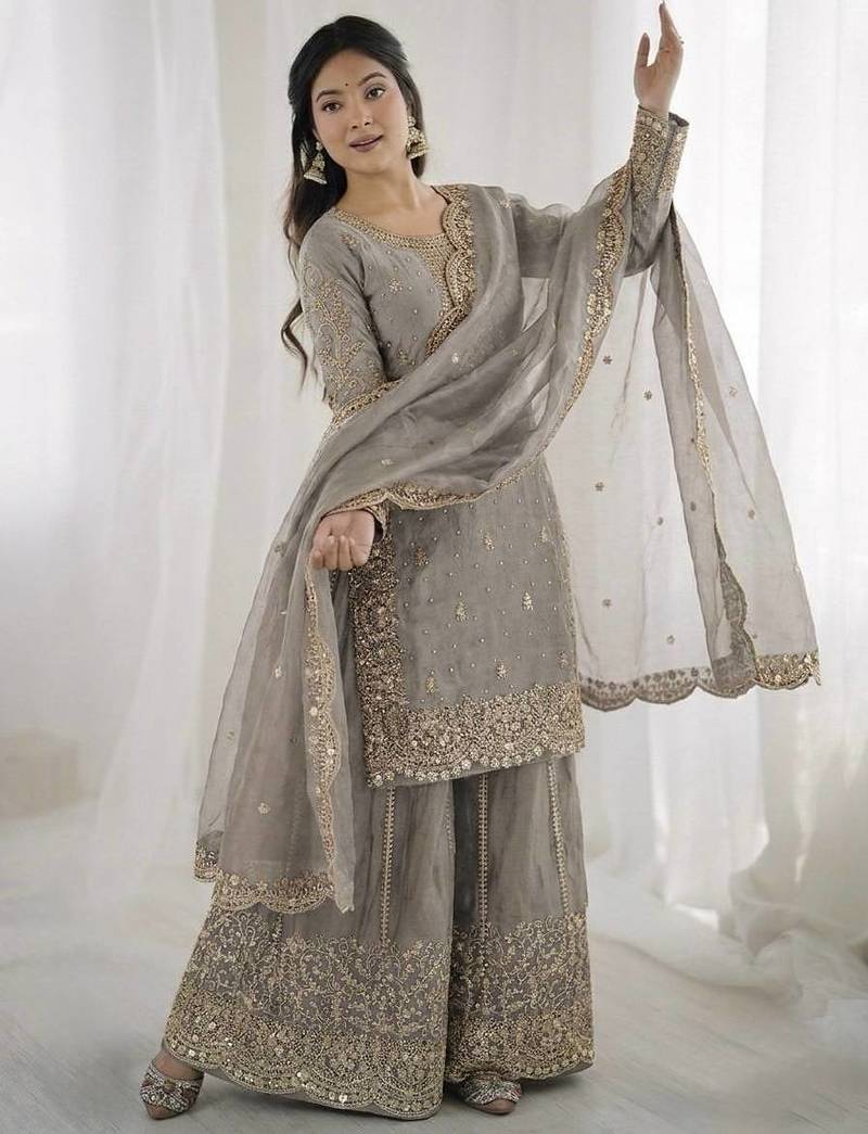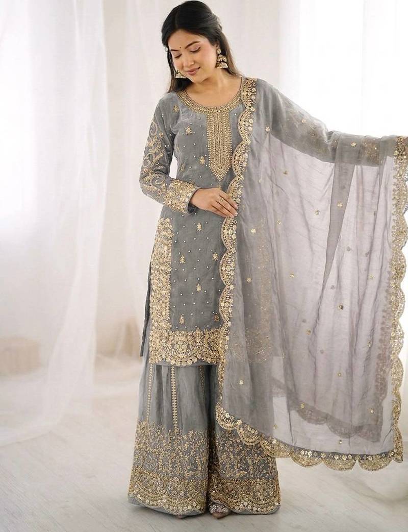 Grey color fendy silk embroidery work wedding wear salwar suit stitched
