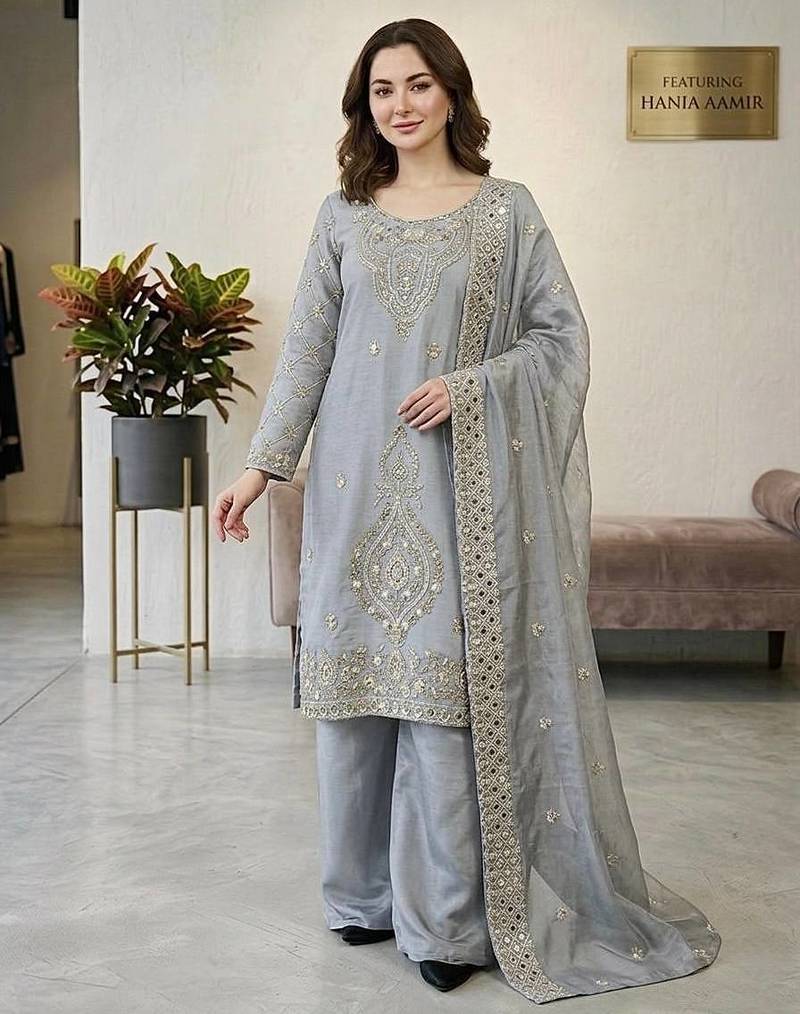 Grey color gimmychu silk embroidery work wedding wear salwar suit stitched