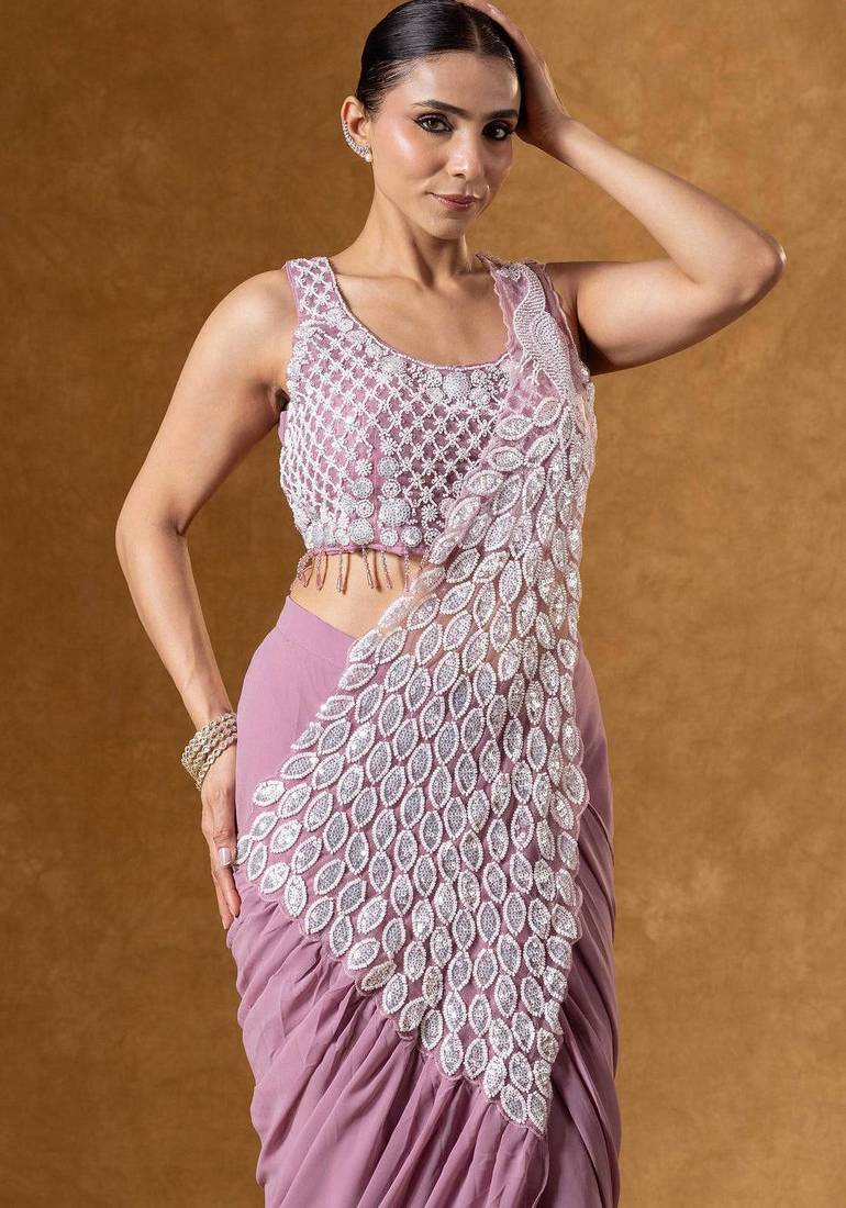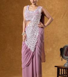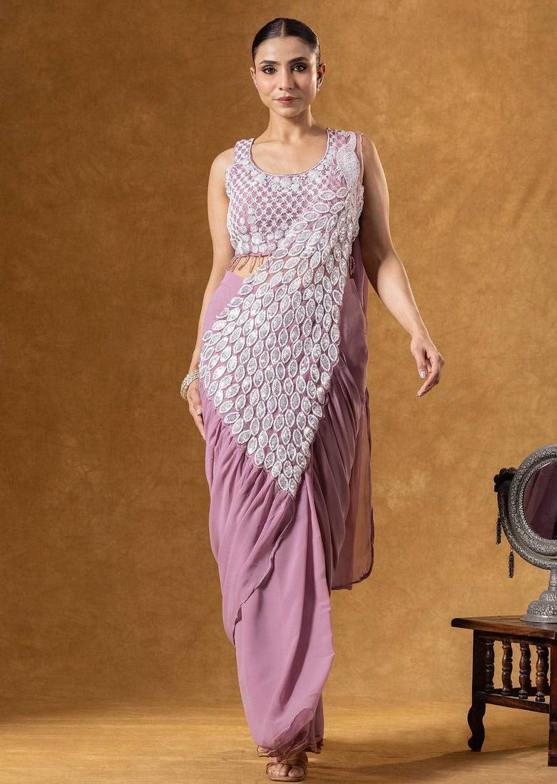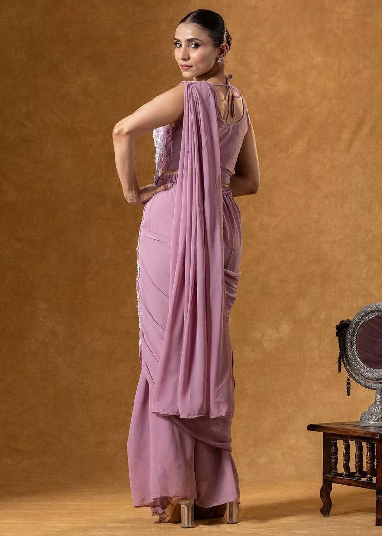 Onion color faux georgette embroidery work pre stitched saree