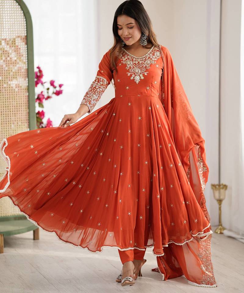Orange color faux georgette embroidery work wedding wear gown stitched