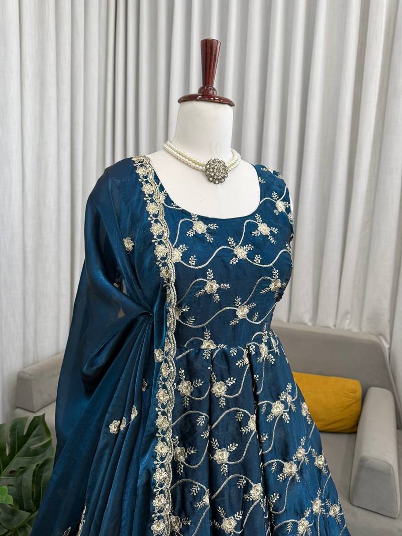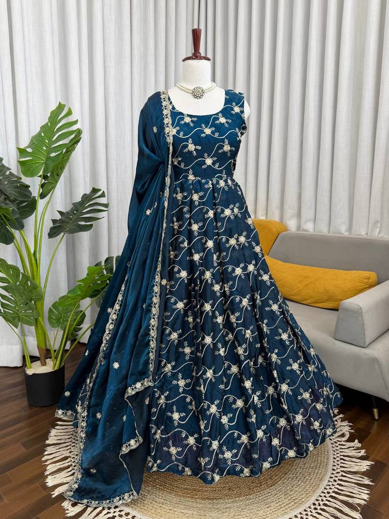 Orange color fendy silk heavy embroidery work wedding wear long gown stitched