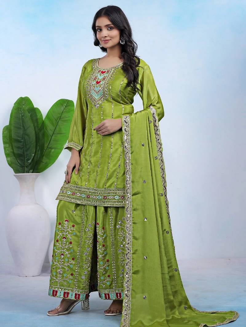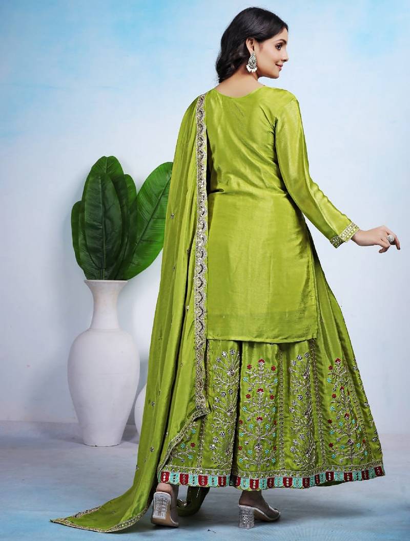 Parrot green color chinnon silk wedding wear trending plazo set stitched