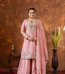 | Product Name | Peach Colour Chinnon Silk Embroidery Work Fully Stitched Plazo Suit | |