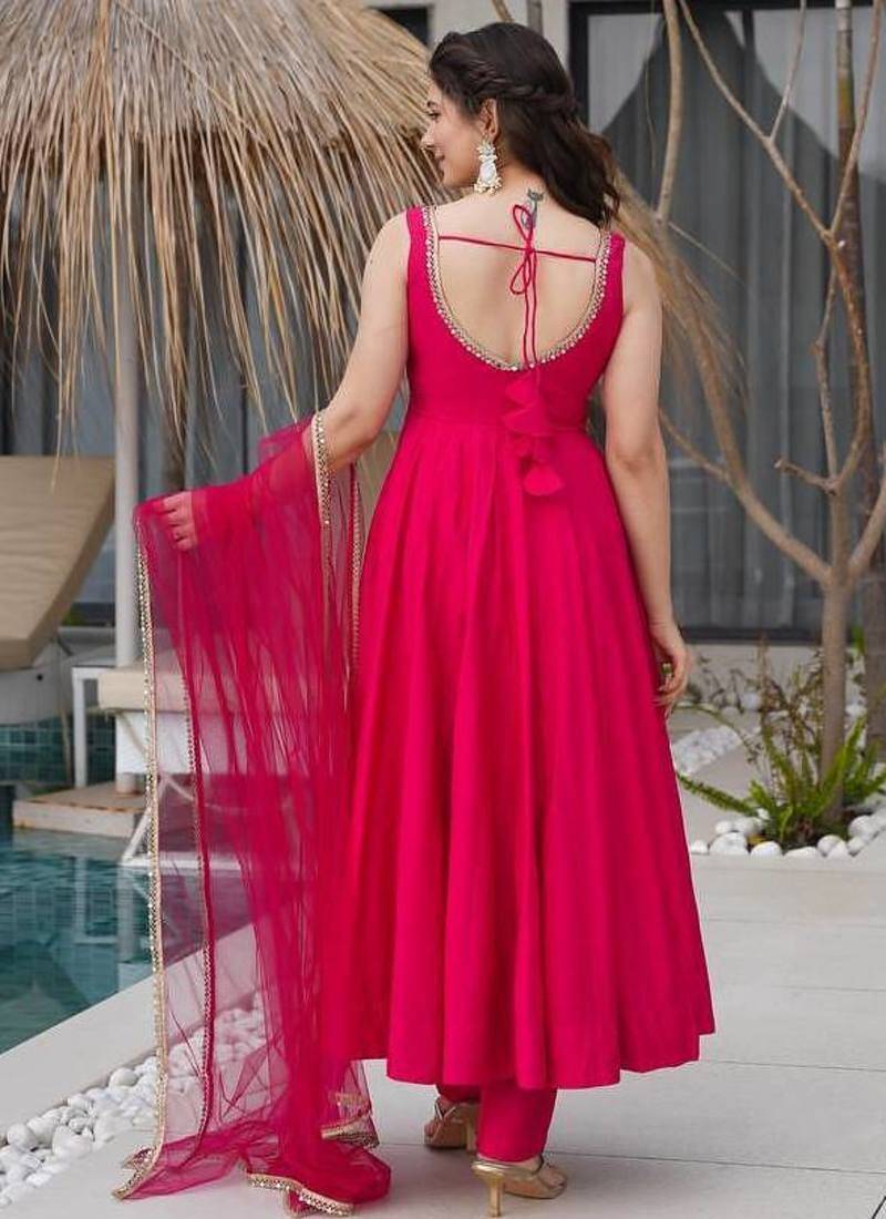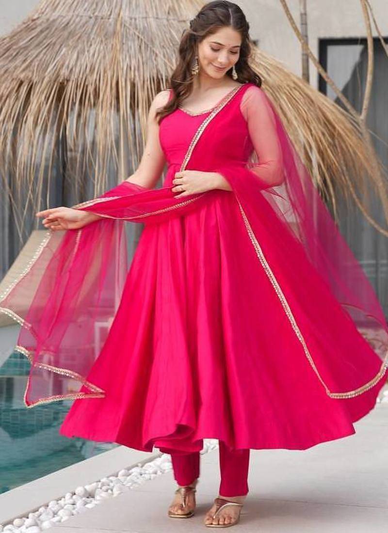 Product Description | Graceful Heavy Pure Roman Silk Chanderi Anarkali Set With 4+ Meter Flair, Microscrape Lining, Soft Net Dupatta With Mirror Lace, Free Size Stitched Pants With Pocket, And Size Options Xs–Xxl. |