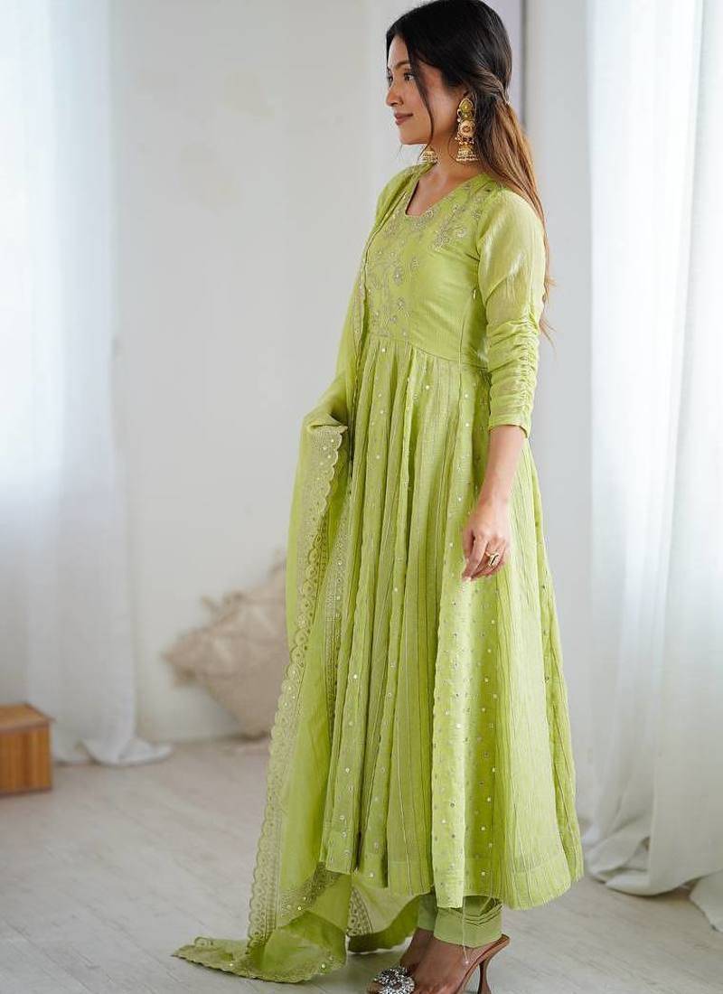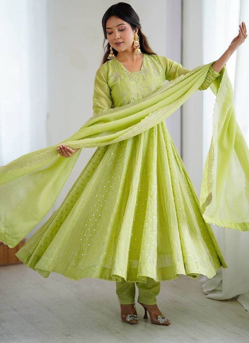 Product Description | **Anarkali Gown Set:** Crunchy Silk Gown With Full Sleeve, Embroidery Sequence Work & Full Flair (47–48") With Heavy Micro Cotton Inner, Micro Cotton Pant (39–40"), And Matching Crunchy Silk Dupatta With Lace Border; Available In M–Xxl; Weight Approx. 850 Gm. |