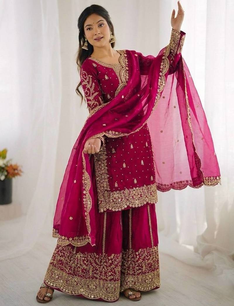 Rani color fendy silk embroidery work wedding wear salwar suit stitched