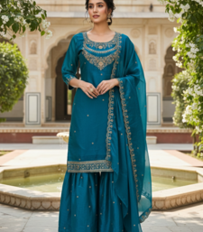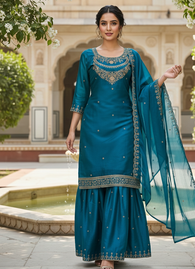 | Product Name | Teal Color Fendy Satin Silk Heavy Embroidery Work Sharara Suit | |