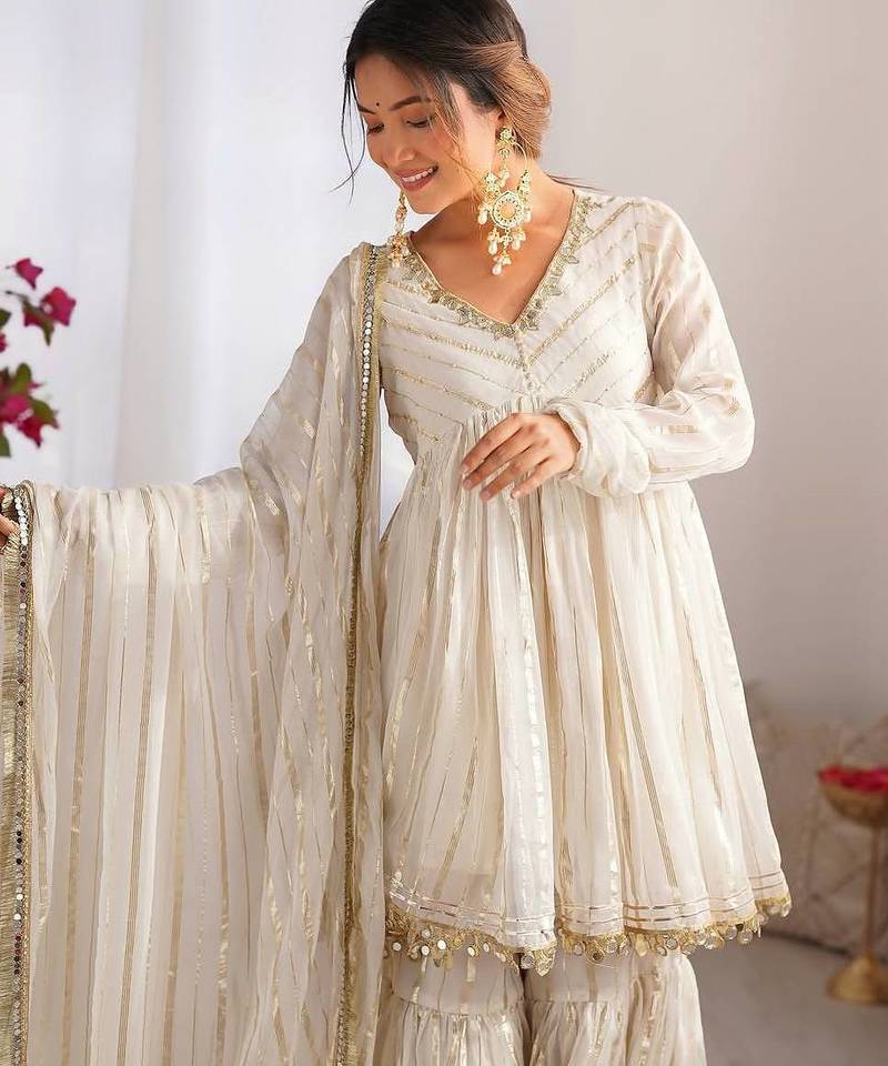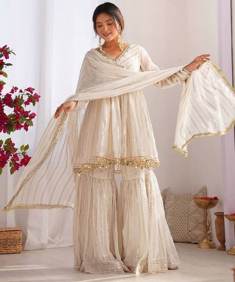 White color mal chnaderi silk mirror work and hand work sharara set stitched