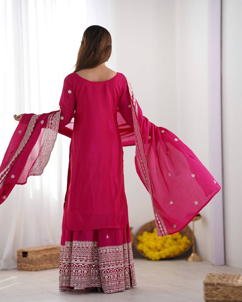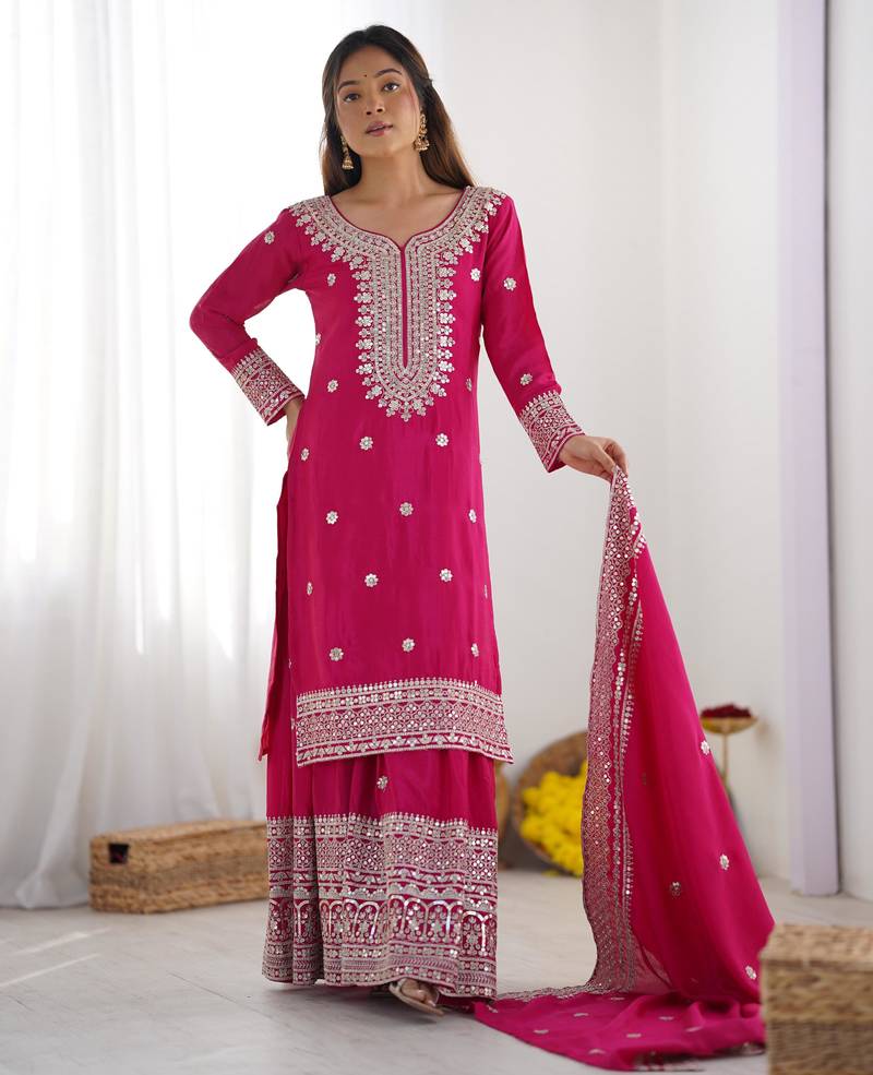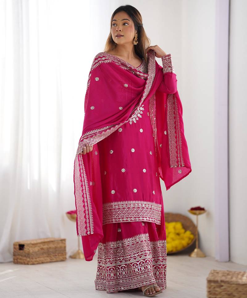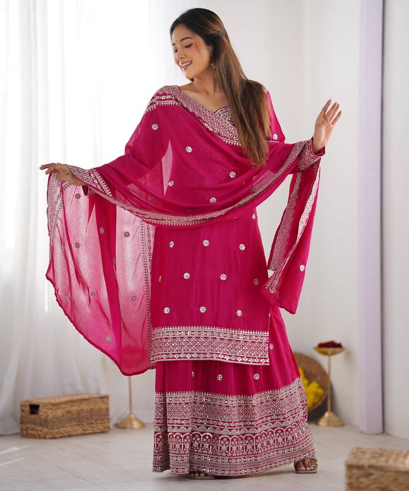 | Product Description | A Beautifully Crafted Outfit Featuring A Pure Heavy Chinnon Silk Top With Embroidery And Sequence Work, Paired With A Fully Flared Sharara/Plazo, And A Lace Bordered Dupatta, All In Heavy Micro Cotton Inner, Weighing 900g And Ready To Wear. |