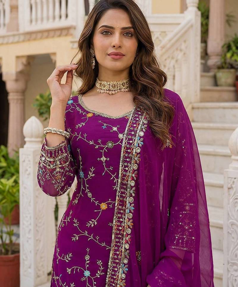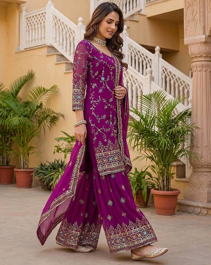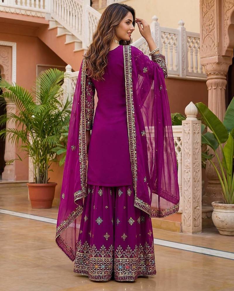 Wine faux georgette multi thread work wedding wear sharara set stitched