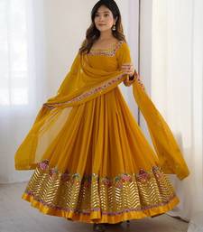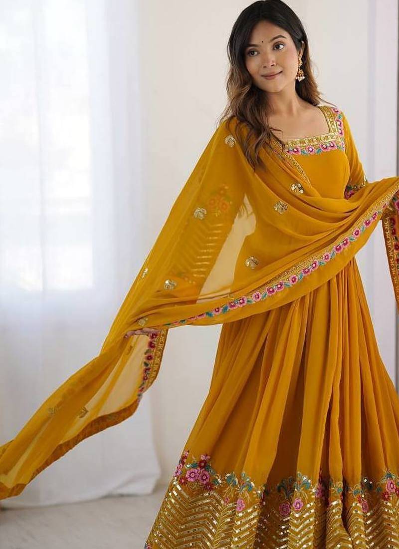 Yellow color heavy georgette wedding wear embroidery work long gown stitched