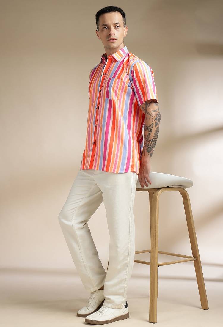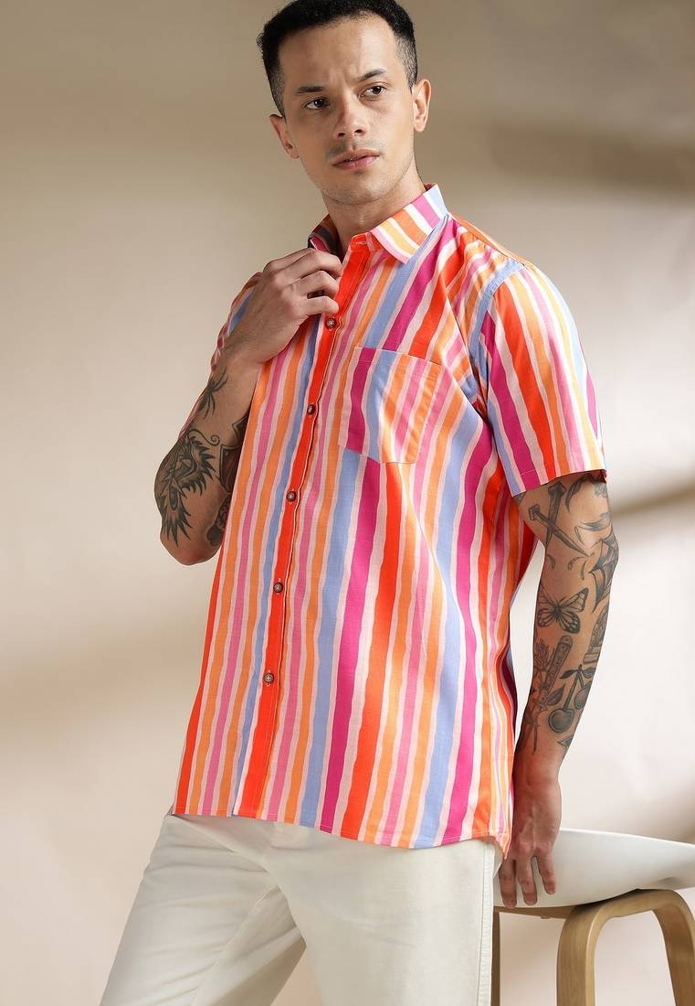| Product Description | Featuring A Multicolor Pastel Cambric Cotton Stripe Shirt With Front Pocket And Front Buttons.