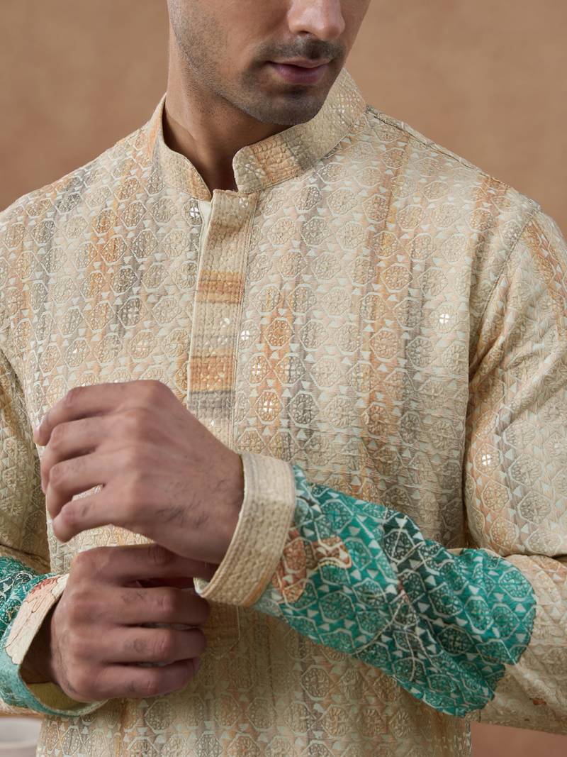 Beige cotton silk printed kurta for men's
