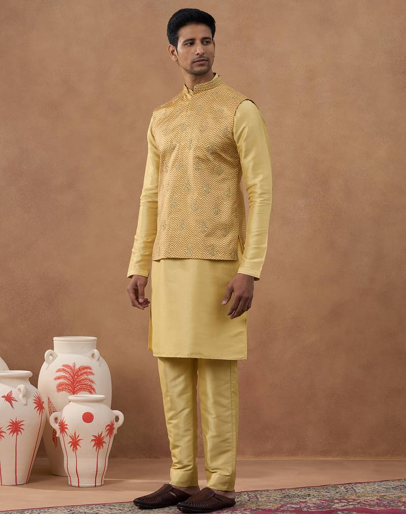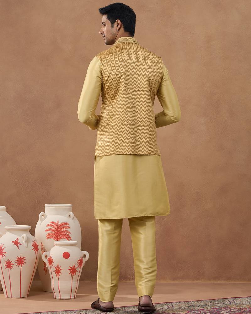 | Product Name | Gold Herringbone Printed Bundi Kurta Set | |