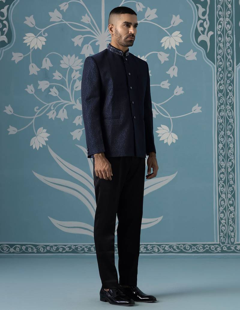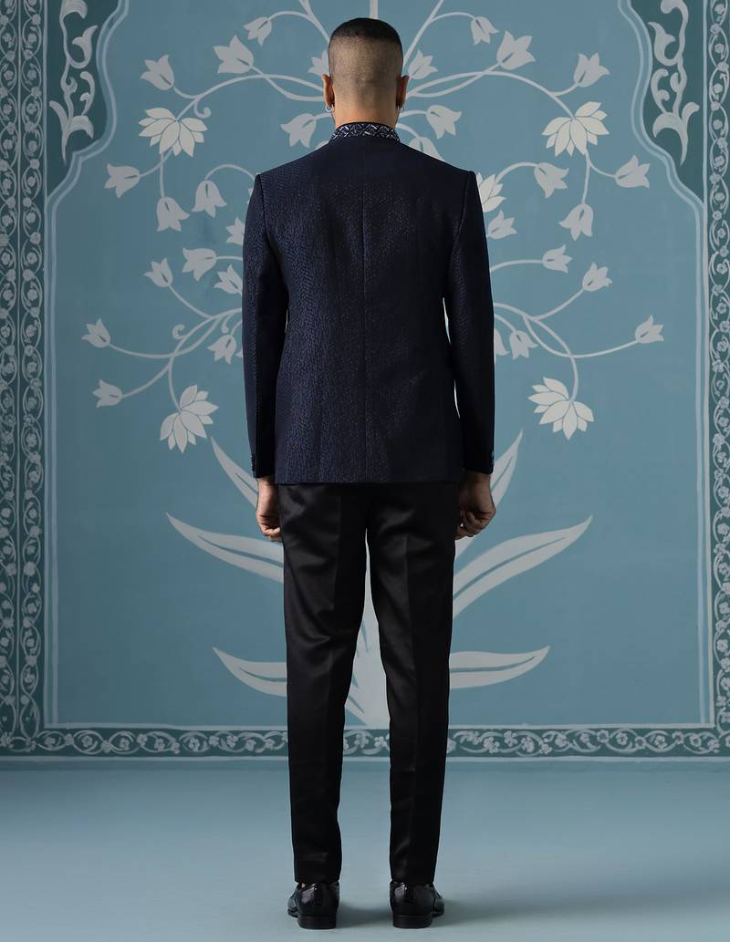 Midnight blue textured bandhgala set