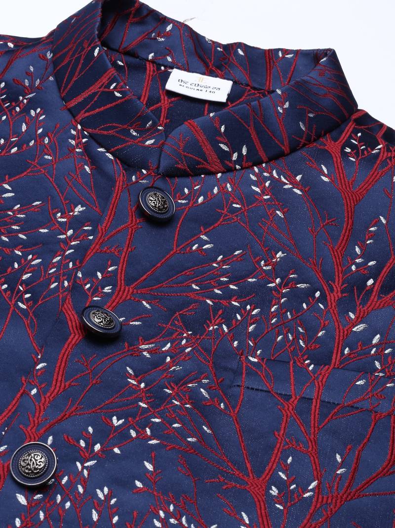 | Product Description | Step Out In Style With This Navy Maroon Jacquard Jacket. Crafted From Imported Fabric, This Stunning Jacket Features A Beautiful Design To Offer You A Unique And Eye Catching Look. Perfect For Cocktail, Sangeet, Or Any Evening Events Needing High Voltage Glamour, This Piece Is Sure To Turn Heads. With A Miter At The Center, This Fashionable Jacket Is Uniquely Tailored For Great Fit. This Set Features A Beautiful Maroon Kurta With Bundi Febric Reverse Applique Detailing On The Collar, Placket And Sleeve Hem. You're Sure To Make A Statement In This Stunning Piece. |