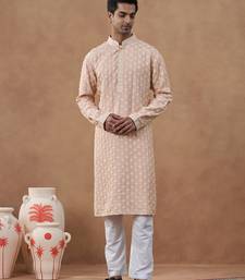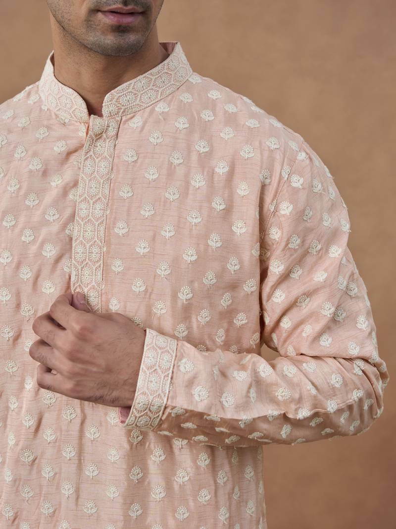 Pink cotton silk embroidered kurta for men's