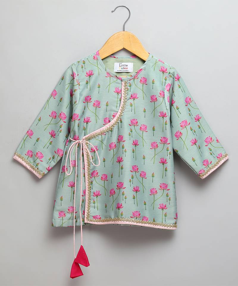 | Product Description | Mint Green Digital Printed Angrakha Kurta With Cotton Lining . Contrast Tassels . Mint Green Silk Dhotis With Lace Finishings . Mukut To Add On The Religious Look