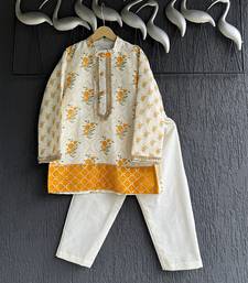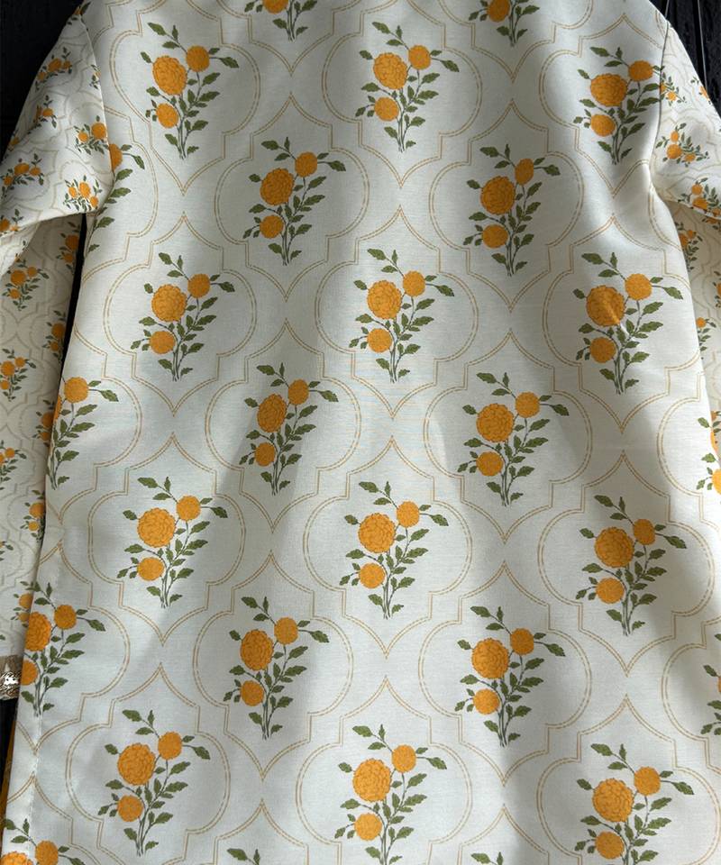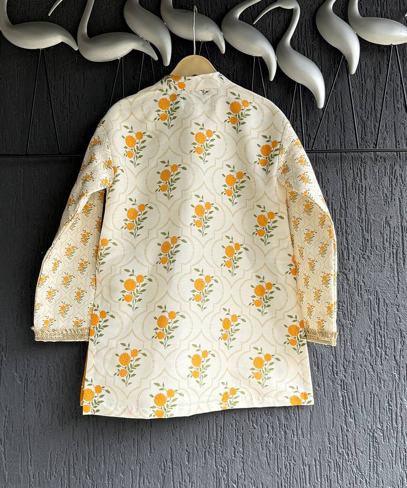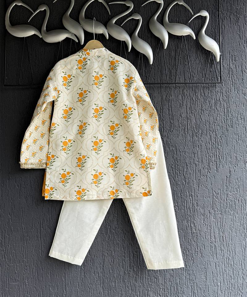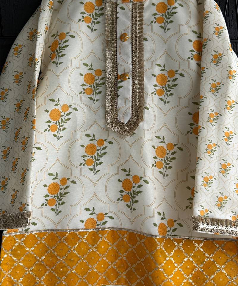 | Product Description | This Is A Graceful Kids’ Kurta Pajama Set Designed In Cream And Mustard Tones. The Cream Colored Kurta Features An All Over Floral Print With Yellow And Green Detailing, Giving It A Fresh And Festive Look. The Neckline Is Highlighted With Golden Lace Embroidery, And The Sleeve Edges Are Finished With Golden Lace For Added Charm. A Contrasting Mustard Yellow Panel With A Diamond Pattern At The Hem Enhances The Overall Design. The Set Is Paired With Plain Cream Pajama Pants, Making It A Perfect Choice For Festive Occasions, Weddings, And Traditional Celebrations.