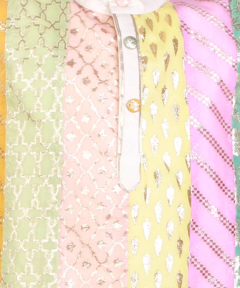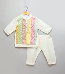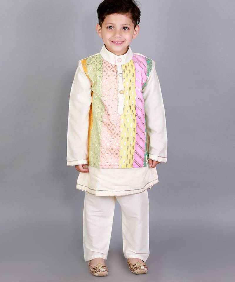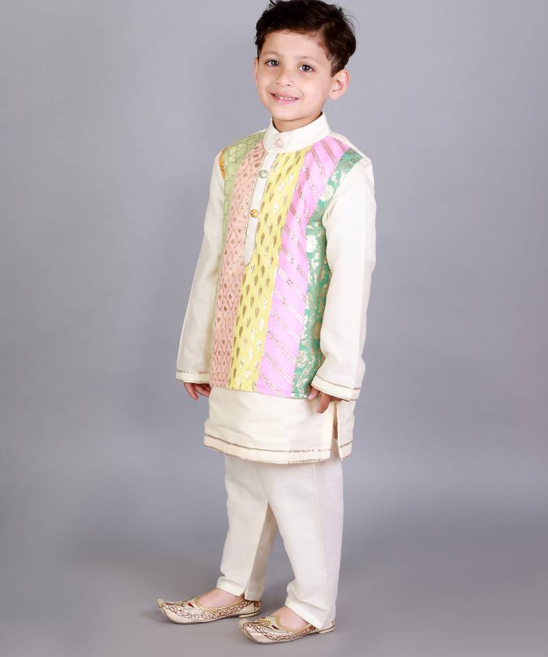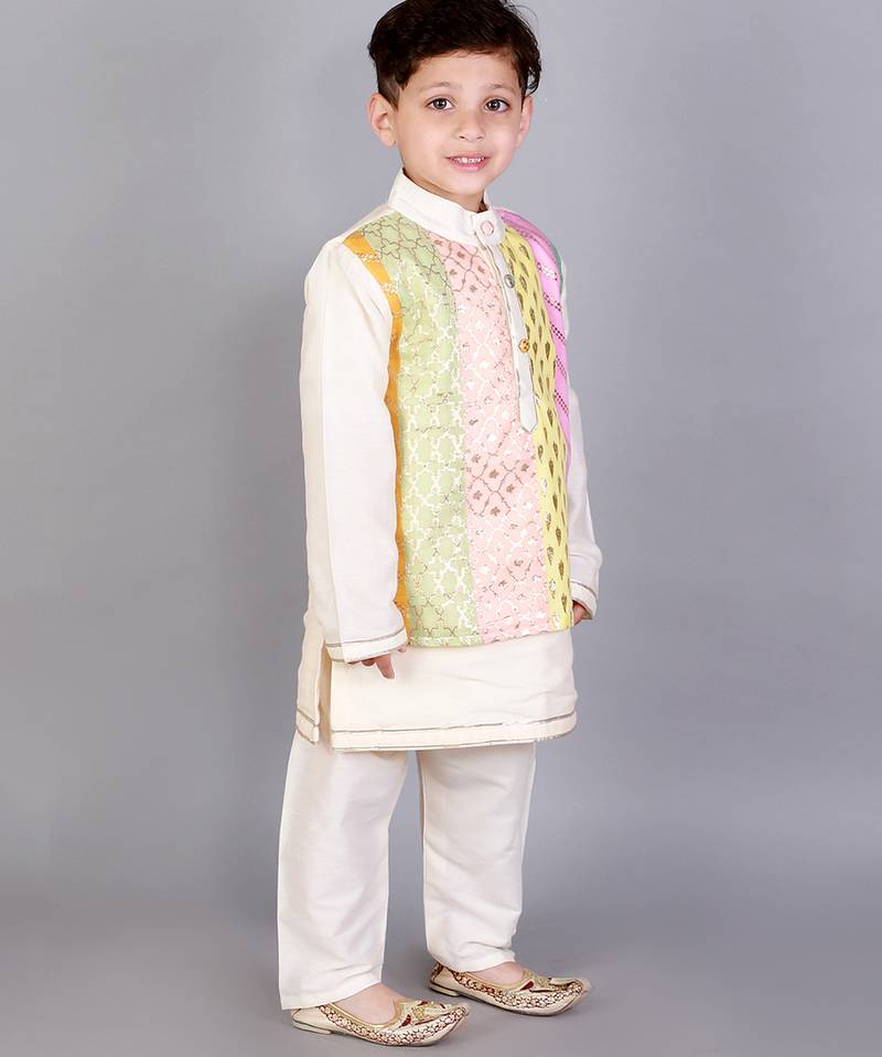 | Product Description | Off White Cotton Silk Kurta With Colorful Zari Panels On Top . Front Placket Opening . Pajama With Elastic.