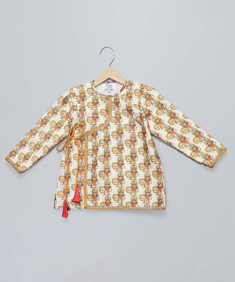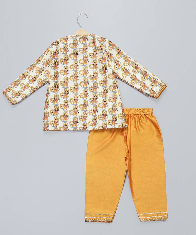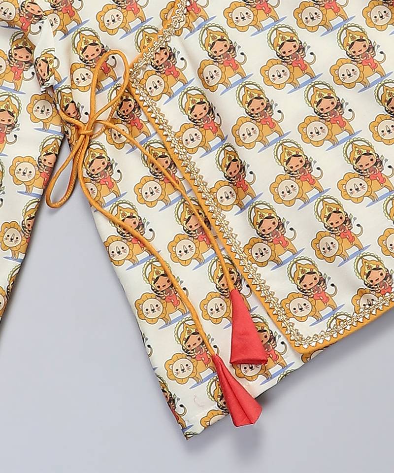 | Product Description | Off White Durga Ji Digital Printed Angrakha Kurta With Cotton Lining . Contrast Tassels . Orange Silk Dhotis With Lace Finishings .Bottom With Elastic All Round .