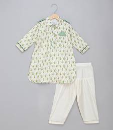 Green printed cotton silk kurta pyjama