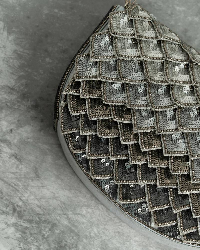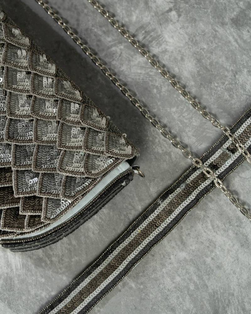 | Product Description | This Grey Silk Sequin Embroidered Clutch Is An Elegant Accessory That Combines Subtle Sophistication With Festive Charm. Made From Premium Silk, It Features Delicate Sequin Embroidery That Adds A Shimmering Effect. Compact Yet Functional, With A Secure Closure, It Is Perfect For Weddings, Parties, And Evening Occasions, Complementing Both Traditional And Contemporary Outfits.
