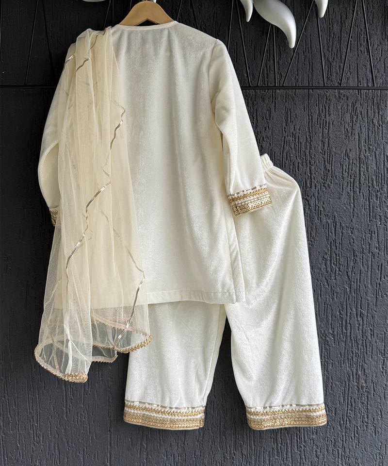 | Product Description | This White Embroidered Velvet Kurta Set Exudes Regal Elegance And Festive Grandeur. Crafted From Rich, Plush Velvet, It Features Intricate Embroidery That Enhances Its Luxurious Appeal. The Tailored Kurta Paired With Coordinated Bottoms Creates A Sophisticated Silhouette, Making It Perfect For Weddings, Celebrations, Or Special Festive Occasions With Timeless Charm.