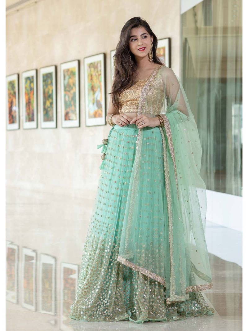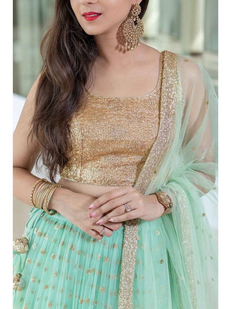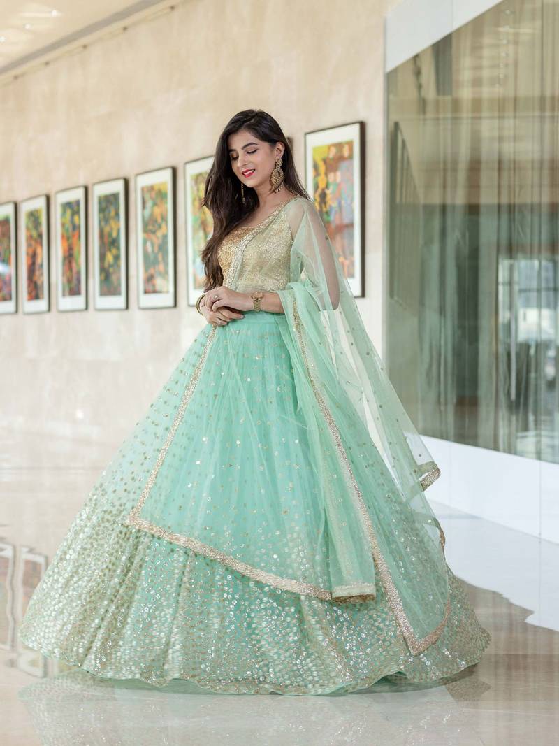 Firoji woman foil work net lehenga choli