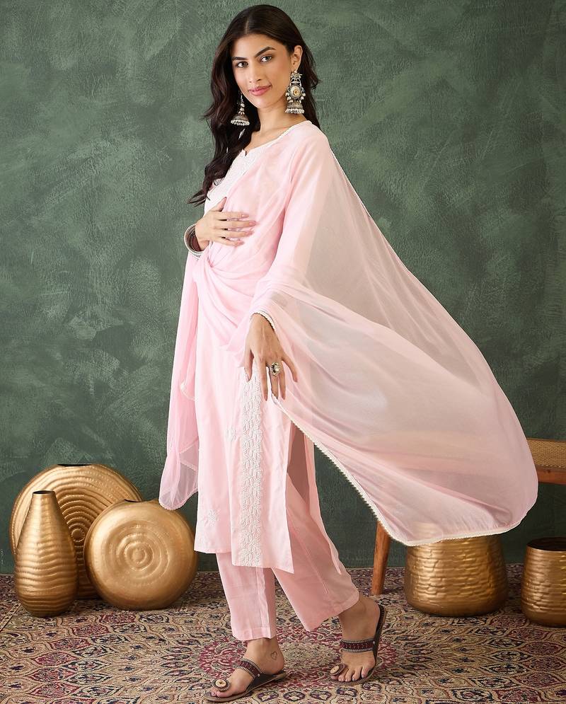 Women gorgeous cotton blend fabric thread work straight kurta, pant and dupatta set