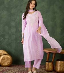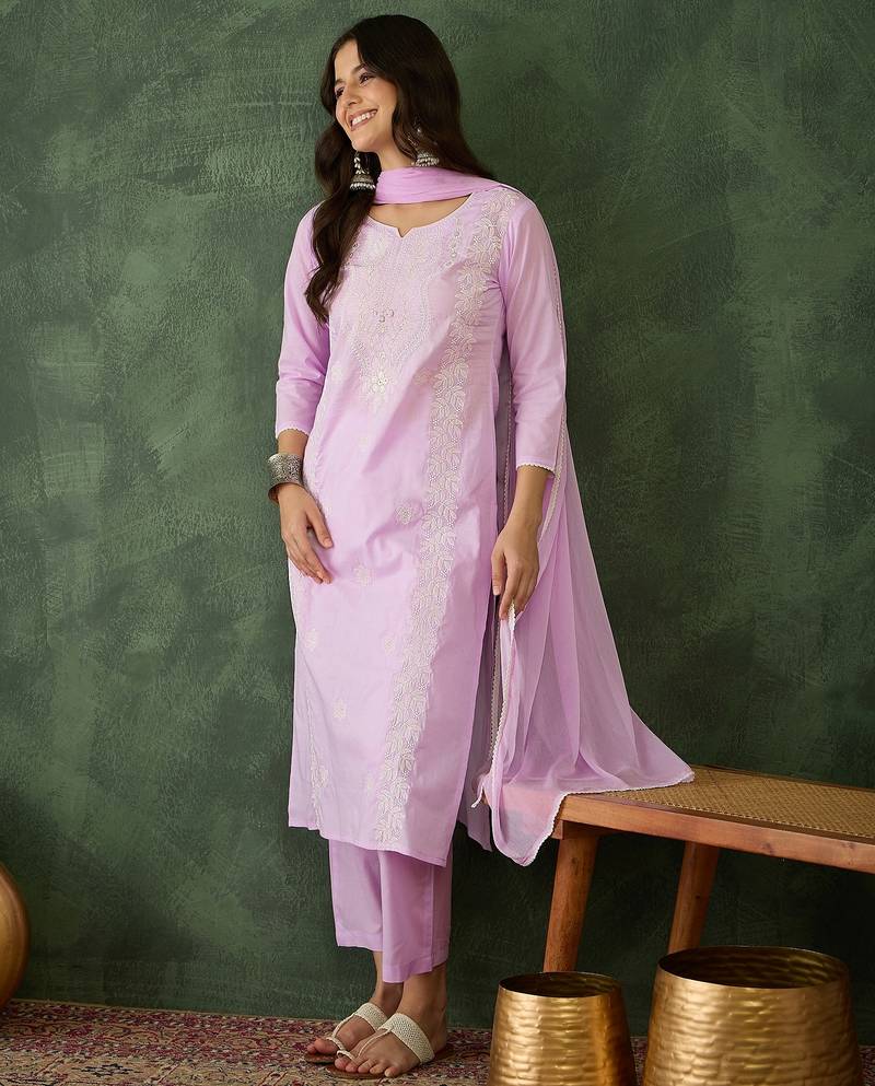 Women gorgeous cotton blend fabric thread work straight kurta, pant and dupatta set