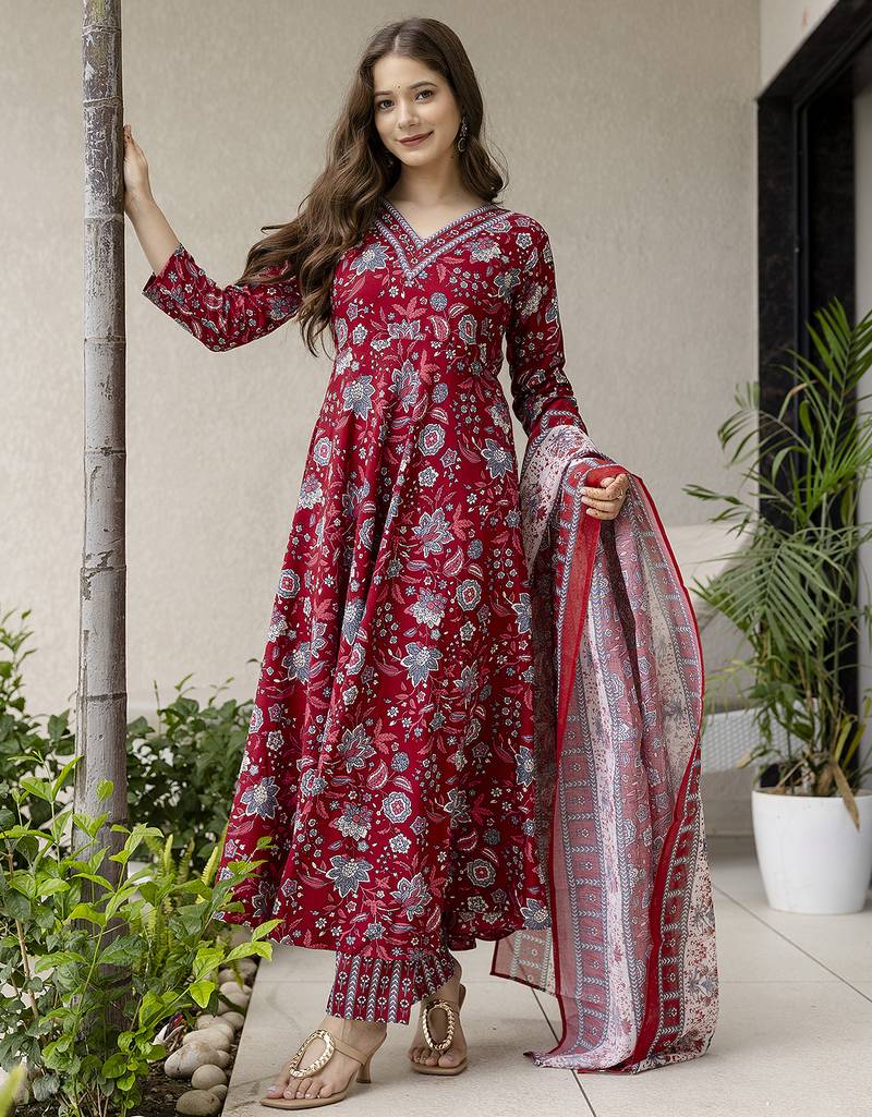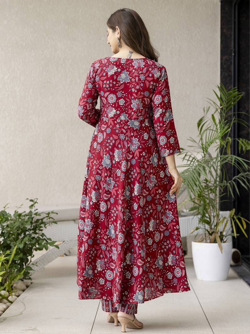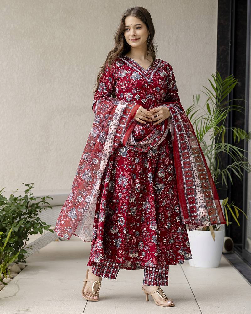 Product Name | Women Gorgeous Rayon Fabric Printed Work Flared Kurta, Pant And Dupatta Set | |