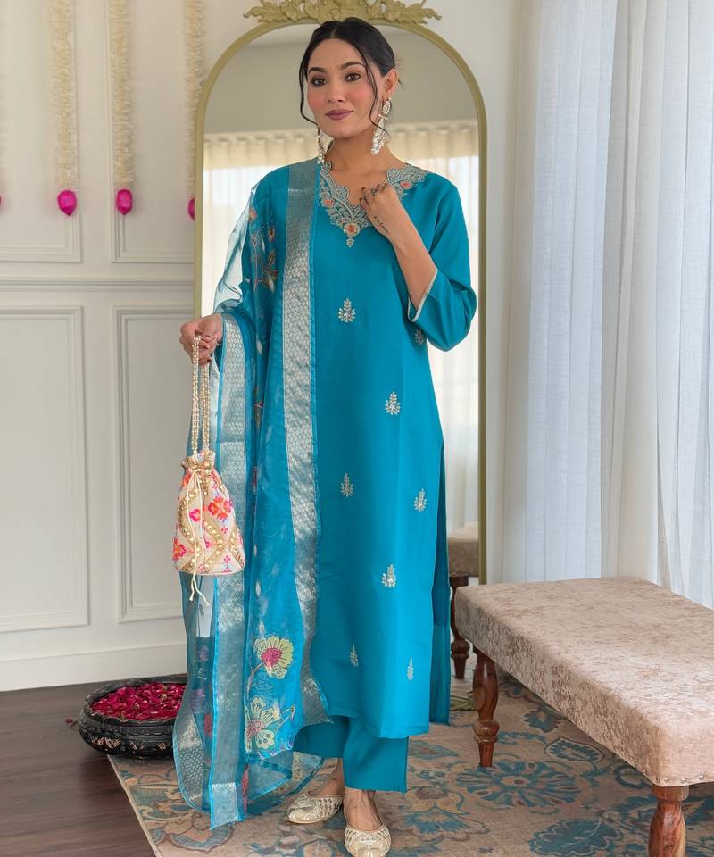 Women gorgeous viscose fabric embroidery work straight kurta, pant and dupatta set