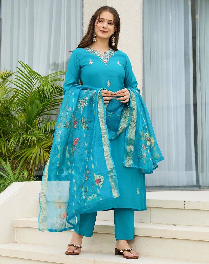 Product Name | Women Gorgeous Viscose Fabric Embroidery Work Straight Kurta, Pant And Dupatta Set | |