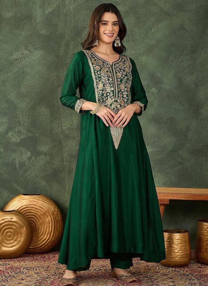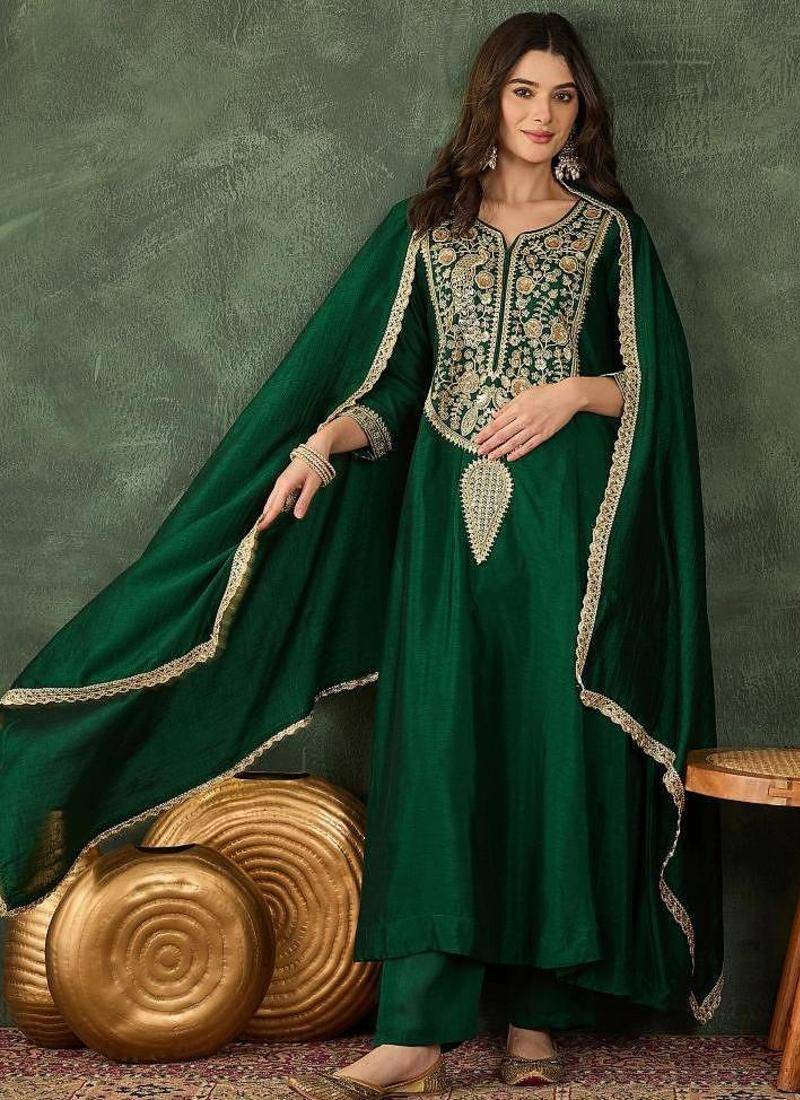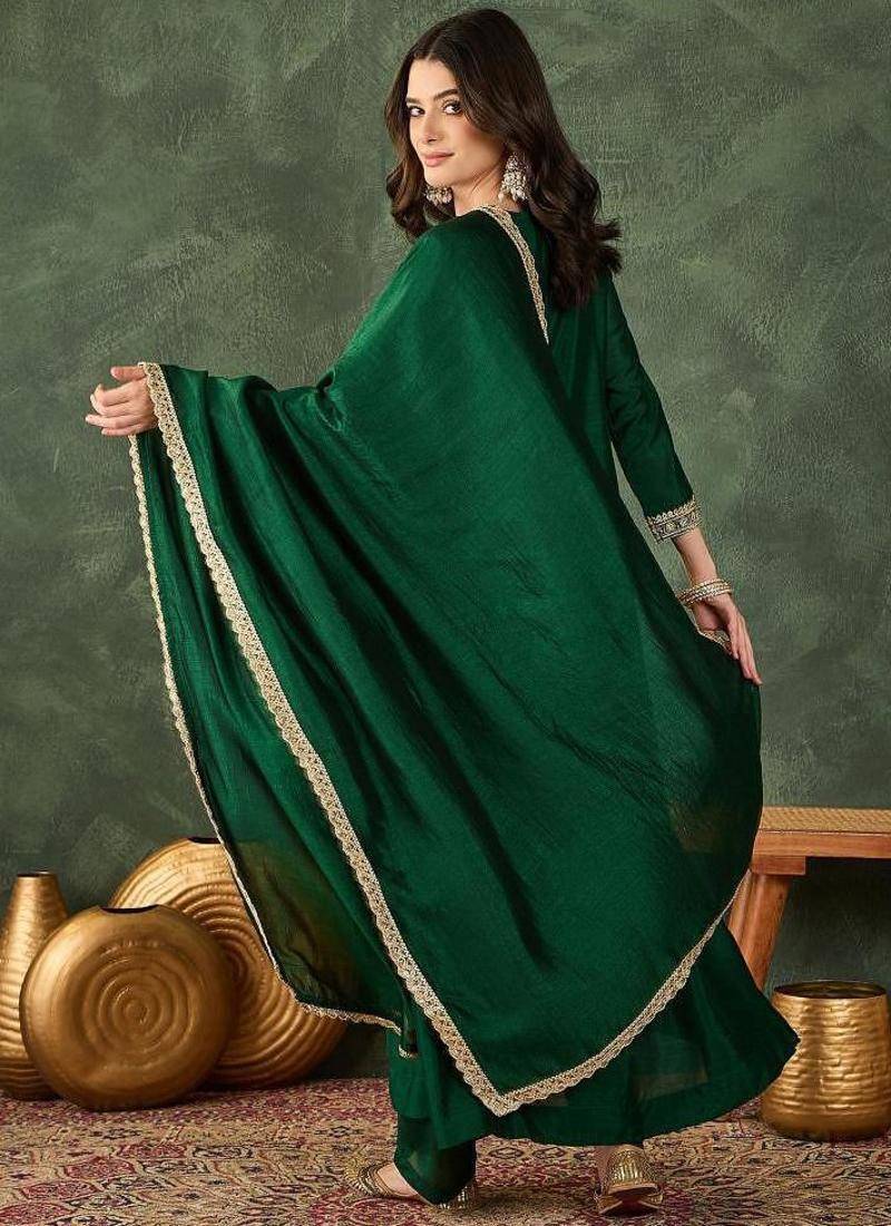 | Product Name | Women's Beautiful Embroidery Work Vichitra Silk Fabric Flared Kurta Pant And Dupatta Set | |