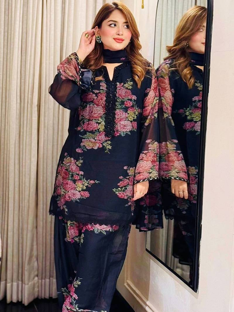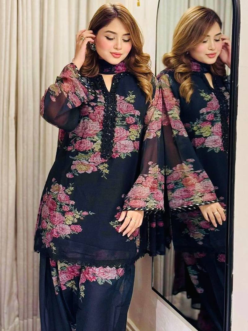 | Product Name | Women's Beautiful Faux Georgette Fabric Printed Work Straight Kurta Palazzo And Dupatta Set | |