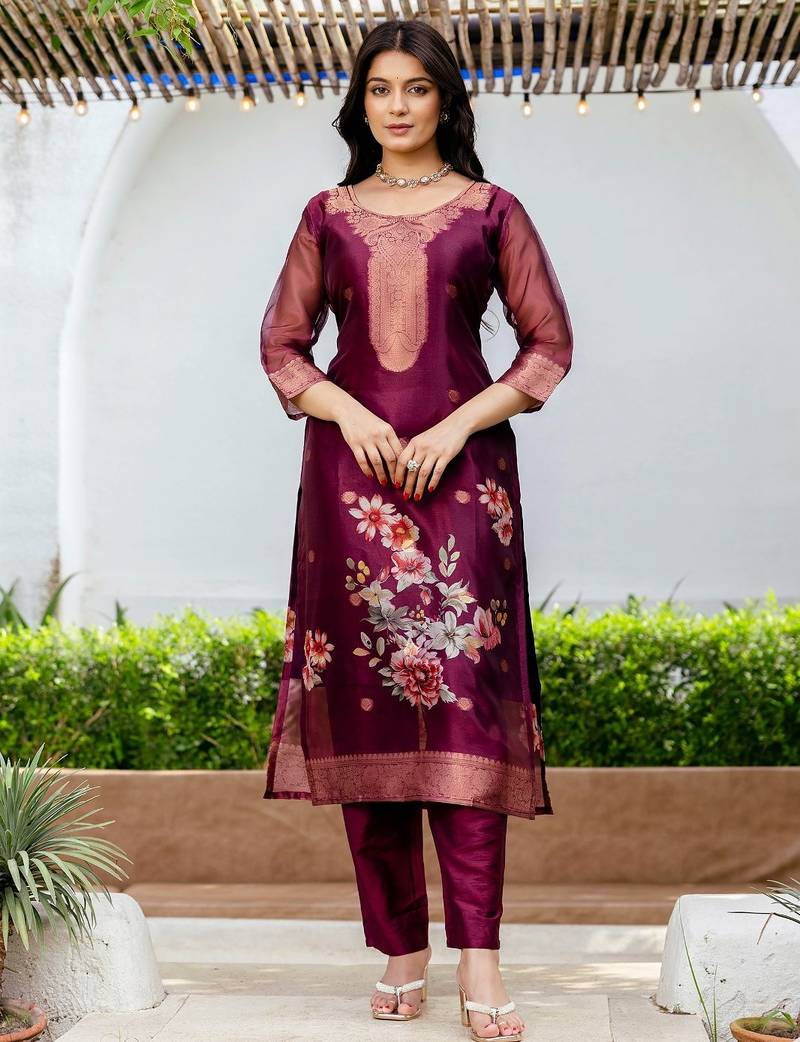 Women's beautiful jacquard printed work organza viscose fabric straight kurta pant and dupatta set