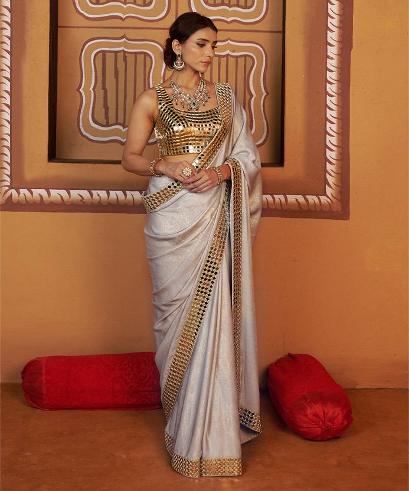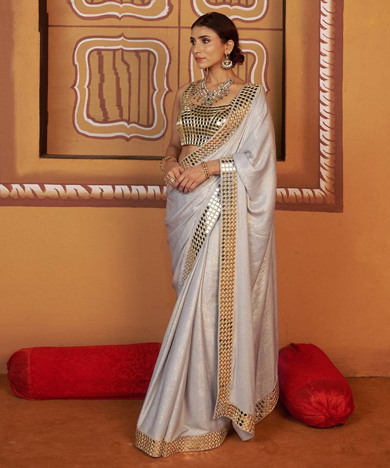 | Product Description | A Timeless Ensemble That Exudes Elegance And Artistry. This Fully Hand Embroidered Mirror Work Blouse In Soft Antique Gold Paired With A Blue Shimmer Saree, Creating A Perfect Fusion Of Tradition And Modern Sophistication. Crafted From Luxurious Imported Fabric, This Set Offers A Luxurious Sheen With All Day Comfort — Ideal For Festive Occasions, Weddings, And Grand Celebrations.