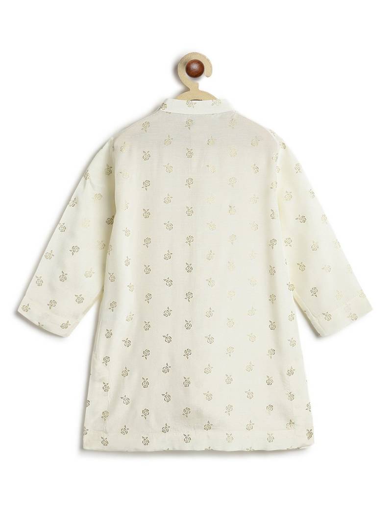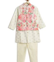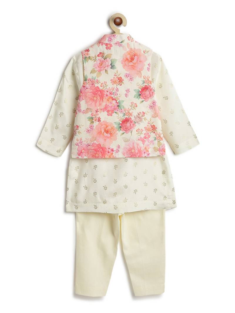 Product Description | For The Little Gentleman Who Loves Color, This Floral Bundi Set Is All About Effortless Style. The Soft Viscose Cream Kurta Features Rose Motifs Foil Print Beautifully From Under A Cream Floral Bundi Tailored To Perfection. Comes With A Matching Pocket Square. Ideal For Weddings, Festivals, And Family Events.