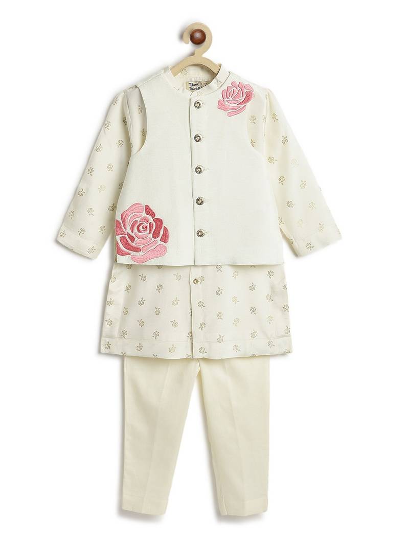 Product Description | Dress Him Like A Little Prince In This Elegant 3 Piece Bundi Set, Perfect For Weddings, Festive Gatherings, Or Family Functions. The Kurta Features A Subtle Buta Print, While The Bundi Jacket Steals The Spotlight With Delicate Rose Embroidery In Soft Hues. Paired With Classic Cream Pants For A Clean Look.