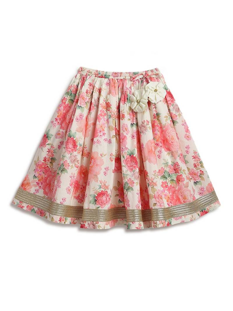 Product Description | A Lehenga Fit For Your Little Festive Star! This Three Piece Set Features An Embroidered Blouse With Dainty Details, A Soft Cotton Lehenga Printed With Blooming Florals, And A Breezy Dupatta To Twirl In. Finished With Lace And Tassels, It’s Perfect For Weddings, Poojas, And All Things Celebratory.