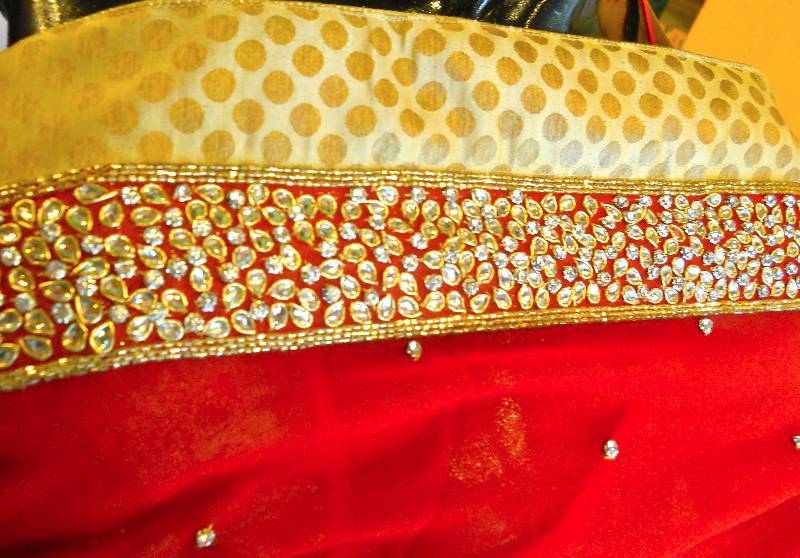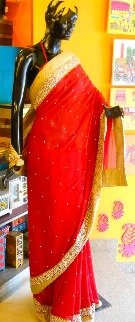 | Product Description | 100% Hand Embroidered In Georgette With #1 A Star Crytalized Stones, Kundan Work And Dhabka. Contrast Gold Blouse With Matching Embroidery At The Front And Back Of The Blouse. |