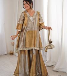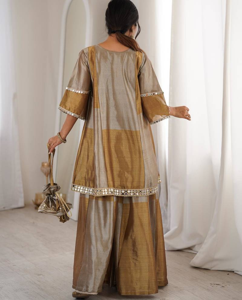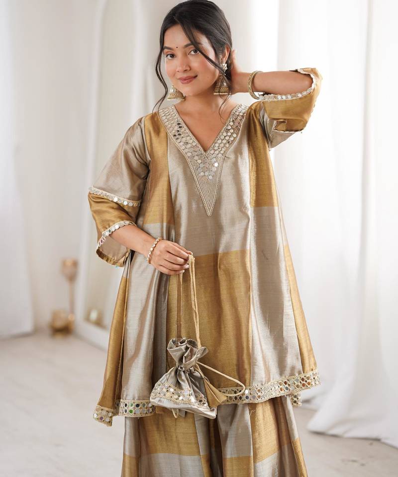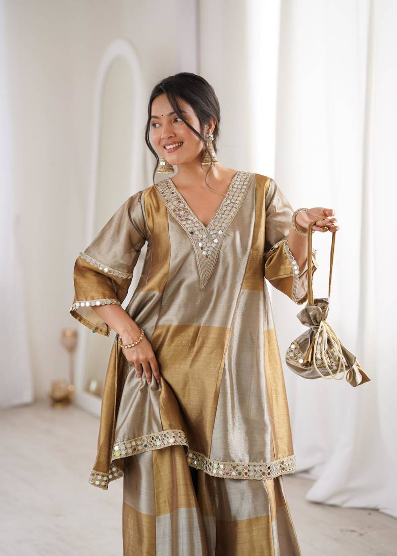 Gold tissue mirror and coding embroidery work kurta with pant and designer batwa stitched