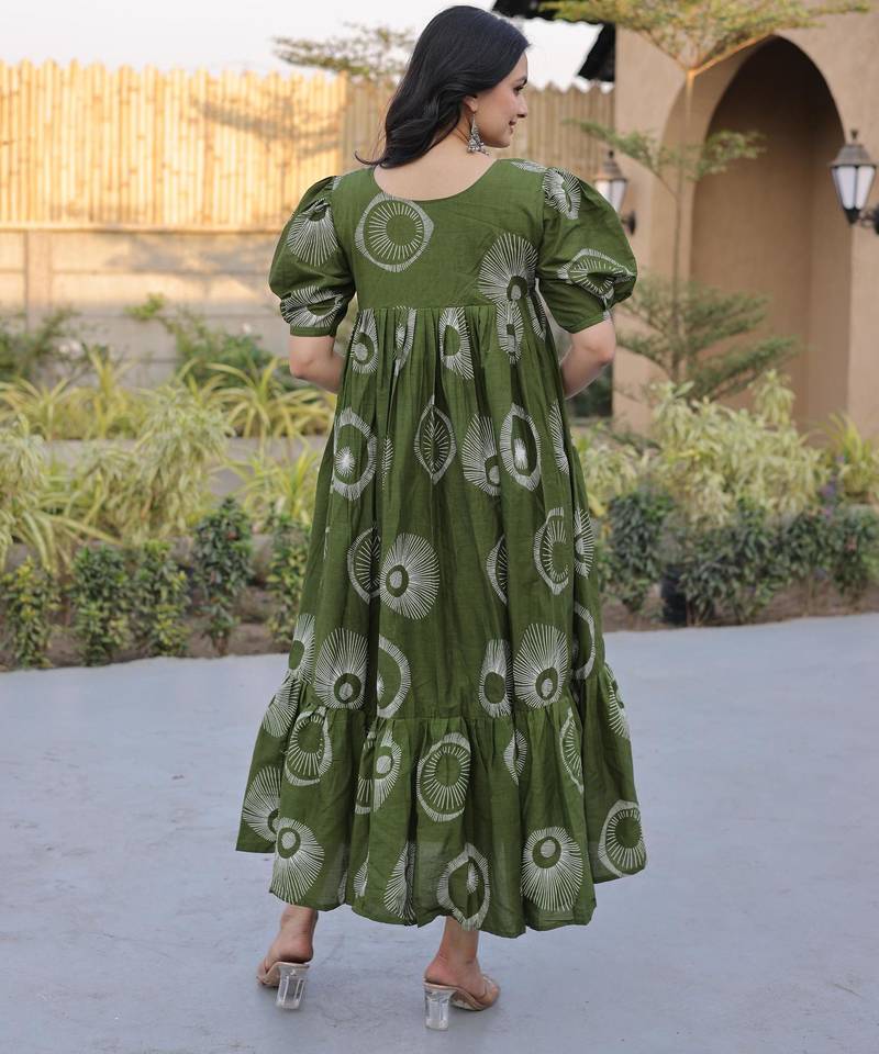 Green cotton printed frill dresses