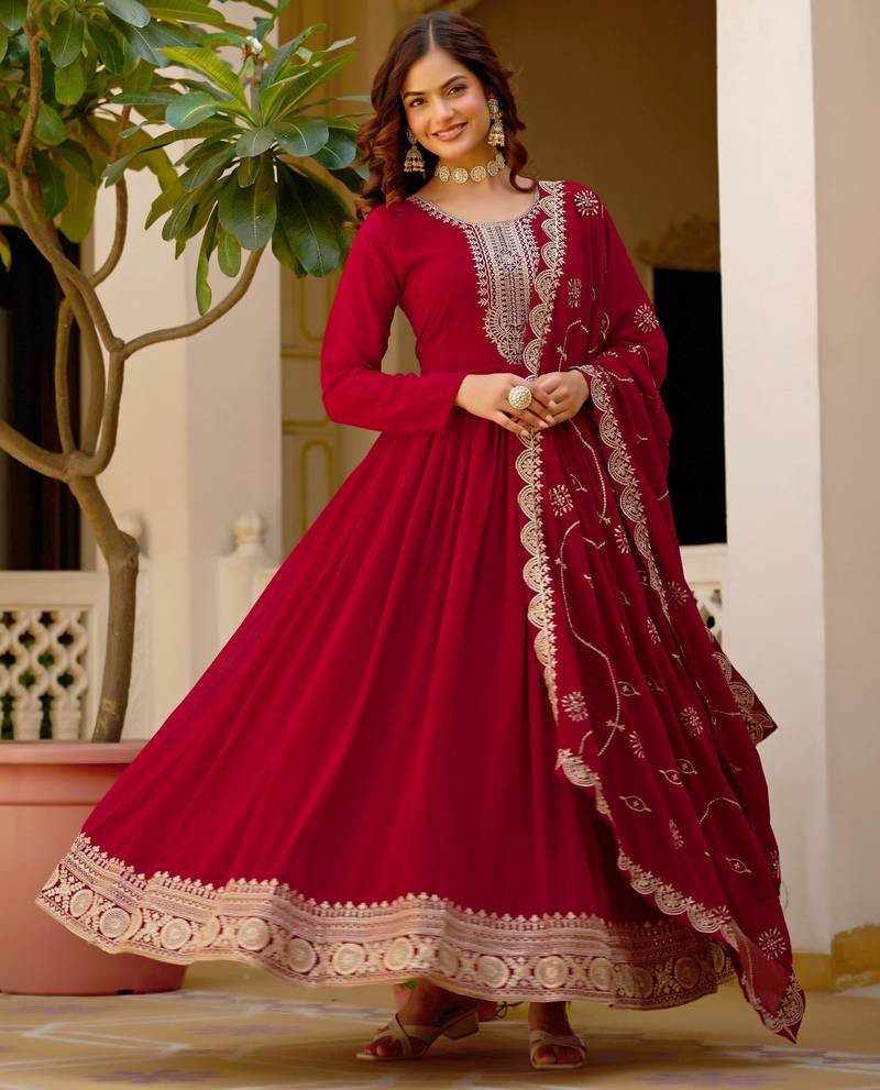 | Product Name | Maroon Faux Georgette Rich Sequins Embroidery Flared Gown With Heavy Dupatta | |